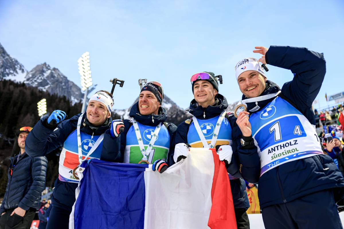 David Zobel übernahm zeitgleich mit Italien und Tschechien, aber mit einem deutlichen Rückstand von 1:40 Minuten auf Rang fünf. Emiliens Jacquelins Vorsprung auf Norwegen schwand durch einen Nachlader im Liegendanschlag nur minimal, allerdings haben sich die Schweden mit dem laufstarken und fehlerfrei gebliebenen Sebastian Samuelsson an die dritte Position geschoben, knapp vor Italien und Tschechien. David Zobels Rückstand wuchs nach drei Nachladern im Liegen auf über zwei Minuten auf der sechsten Position und hinter ihm attackierte in der nächsten Runde der Schweizer Niklas Hartweg. Emilien Jacquelin hatte Richtung Stehendanschlag einen leichten Sturz, aber sein Gewehr schien dadurch unversehrt geblieben zu sein und er ließ seine fünf Scheiben weiß werden. Der Norweger Vetle Sjaastad Christiansen verfehlte im entscheidenden Anschlag die letzte Scheibe, benötigte zwei Nachlader und hatte nun den erneut fehlerfrei gebliebenen Samuelsson nur sechs Sekunden hinter sich. Tommaso Giacomel benötigte eine Reservepatrone und hatte den Schießstand nur 8,5 Sekunden hinter dem Schweden auf dem vierten Platz verlassen. David Zobel konnte auch mit drei Nachladern die Strafrunde nicht vermeiden und fiel auf die siebte Position zurück. Während Jacquelin entspannt den Zieleinlauf zum vierten Saisonsieg der Herrenstaffel vor den applaudierenden Zuschauern in der Südtirol Arena genießen konnte, kämpften Norwegen und Schweden hart um die Positionen. Auf dem neu gebauten Zieleinlauf, der hinten über den Schießstand verläuft, war Samuelsson dicht am Norweger dran aber im Sprint auf der Ziellinie setzte sich schließlich doch der Norweger durch kräftige Stockschübe durch und sicherte sich Silber 0,4 Sekunden vor Schweden auf dem Bronzerang.