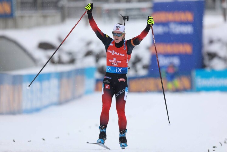 Es ist das alte Lied – zu viele Fehler am Schießstand verhinderten einen besseren Ausgang des Verfolgungsrennens für die deutschen Damen. Franziska Preuß von einem aussichtsreichen dritten Rang gestartet, fiel nach dem ersten Fehler beim zweiten Schießen etwas zurück, brachte dann die Null und hatte bis zum letzten Schießen Chancen auf das Podest. Beim letzten Anschlag schoss sie mit viel Risiko, leider zwei Fehler, und war damit aus dem Rennen um das Podest. Auf der Schlussrunde gab sie nochmal alles und sicherte sich Rang acht. „Ich weiß, achter Platz ist im Weltcup auch schwer zu erreichen, da muss man um jeden Top-10-Platz froh sein, aber es ist trotzdem ärgerlich, weil ich zum Schluss nochmal zwei Fehler geschossen habe. Da wäre schon noch was möglich gewesen nach vorne, aber ja ich bin dann als Neunte raus und hab noch mal voll um den achten Platz gekämpft, hab ihn gewonnen. Es war am Schießstand eine gute Serie dabei, die speichere ich ganz fest ab und dann geht es nächste Woche wieder weiter. Dann schaue ich, dass ich da wieder anknüpfen kann“, so Franziska Preuß nach dem Wettkampf, die sich tatsächlich in dem zuschauerleeren Stadion von den Worten des Stadionsprechers etwas irritieren ließ und im Übrigen mit den Platzierungen der ersten Woche in Hochfilzen zufrieden war.