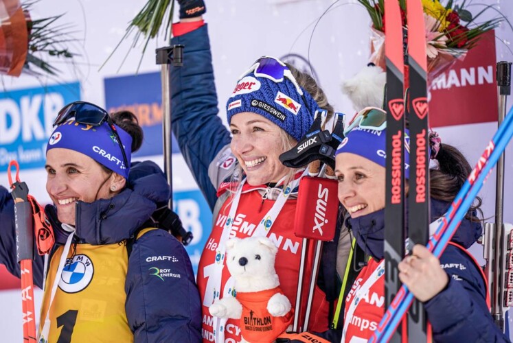 Für einen Sieg hat es nicht ganz gereicht, dennoch platzierten sich fünf Französinnen in den Top-8. Nach zwei Extrarunden landete die derzeit Führende in der Gesamtweltcupwertung Julia Simon nur 12,3 Sek. hinter der Siegerin auf dem Silberrang und hat damit das gelbe Trikot erfolgreich verteidigt. Auch im letzten Jahr wurde Julia Simon Zweite, damals hinter Elvira Oeberg. Die Schwedin schaffte es heute nicht auf das Podest, obwohl sie von ihren Trainern und Betreuern lautstark die Anstiege hochgebrüllt wurde. Am Ende kam sie 1,5 nach Anais Chevalier-Bouchet auf Rang vier ins Ziel. Rang fünf und sechs belegten die Französinnen Sophie Chauveau und Lou Jeanmonnot. Damit durften sich vier Französinnen über die Teilnahme an der Flowerceremony freuen und wurden dort von Trainern, Betreuern und dem französischen Publikum entsprechend gefeiert.