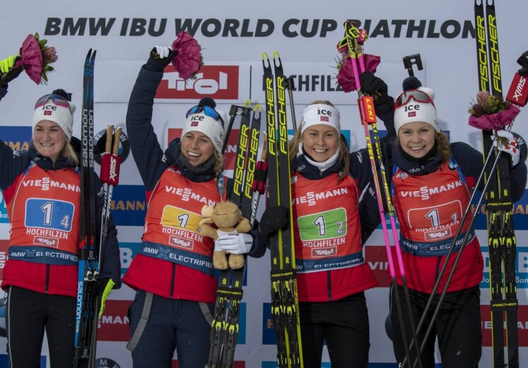 Die norwegischen Damen mit Karoline Offigstadt Knotten, Ingrid Landmark Tandrevold, Tiril Eckhoff und Schlussläuferin Marte Olsbu Roeiseland gewinnen nach Östersund auch die Staffel in Hochfilzen. Sie haben sich nach einer Strafrunde von Ingrid Landmark Tandrevold nicht aufgegeben und eine überragende Tiril Eckhoff holte in ihren Runden zehn Positionen und mehr als 40 Sek. auf die führenden Russinnen mit Kristina Reztsova, Larisa Kuklina, Svetlana Mironova und Ekaterina Yurlova-Percht auf. Mit je einem Nachlader im liegenden und im stehenden Anschlag und der schnellsten Laufzeit in ihrer Runde schickte sie ihre Schlussläuferin Marte Olsbu Roeiseland an zweiter Position ins Rennen. Roeiseland kam bis zum Stehendschießen nicht entscheidend an Ekaterina Yurlova-Percht heran. Bei ihr fiel die letzte Scheibe erst mit einem Nachlader, Marte Olsbu Roeiseland behielt die Konzentration und machte sich mit 15,3 Sek. Rückstand hinter der Russin an zweiter Position auf die Schlussrunde. Bereits auf der Hälfte der Schlussrunde hatte die Norwegerin Yurlova-Percht eingeholt, legte schnell ein paar Meter zwischen sich und der Russin und führte ihre Staffel schließlich mit 8,2 Sek. Vorsprung auch beim zweiten Staffelwettkampf zum Sieg.