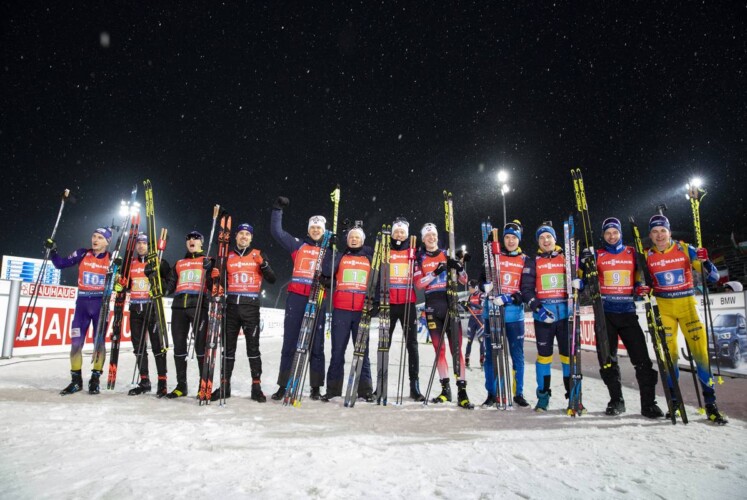 Die Herren-Staffel aus Norwegen startete in derselben Besetzung, mit der sie bei der Weltmeisterschaft in Antholz Silber holten. Vetle Sjastaad Christiansen, Johannes Dale, Tarjei Boe und Johannes Thingnes Boe feierten den Sieg bereits im Ziel, als dahinter noch um die verbleibenden Podestplätze gefightet wurde. Johannes Thingnes Boe ging mit einem Vorsprung von über einer Minute auf die Schlussrunde, winkte den wenigen Zaungästen von der Spur aus zu und kam 38,2 Sek. vor der Ukraine ins Ziel. Sein Team benötigte insgesamt nur fünf Nachlader, ebenso die zweitplatzierten aus der Ukraine mit Artem Pryma, Sergii Semenov, Ruslan Tkalenko und dem sicheren Schützen Dmytro Pidruchnyi. Im Kampf um Rang drei setzte sich schließlich das Team aus Schweden mit Sebastian Samuelsson, Jesper Nelin, Peppe Femling und Martin Ponsiluoma durch. Mit einer Strafrunde und acht Nachladern belastet hatten sie 5,1 Sek. Rückstand auf den Silberrang.