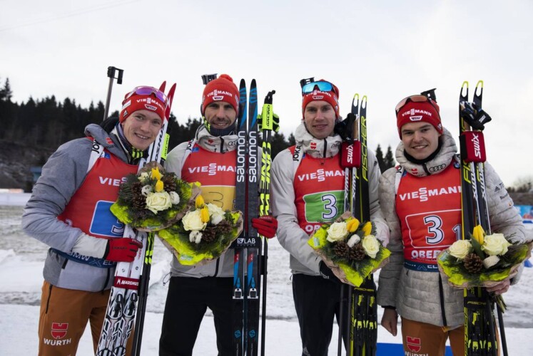 Das deutsche Herrenteam in der Besetzung Philipp Horn, Johannes Kühn, Arnd Peiffer und Schlussläufer Benedikt Doll belegte hinter den Franzosen Emilien Jacquelin, Martin Fourcade, Simon Desthieux und Quentin Fillon Maillet Rang drei. Philipp Horn benötigte liegend, in seinem schwächeren Anschlag, alle drei Nachlader um die Strafrunde zu vermeiden, blieb stehend fehlerfrei und hat nach einer hervorragenden Schlussrunde an neunter Position mit 22,8 Sek. auf Johannes Kühn übergeben. Nach einer schnellen Serie im Liegen machte Kühn Plätze gut, aber im stehenden Anschlag kassierte er bei schwierigen Bedingungen eine Strafrunde, fiel wieder zurück und hat seinen Rückstand mit einer Top-Laufleistung in Grenzen gehalten und schließlich an sechster Position an Arnd Peiffer übergeben. Aber auch bei ihm lief es am Schießstand nicht nach Plan. Zwei Nachlader bei der liegenden Serie und alle drei im stehenden Anschlag waren dem wechselnden Wind geschuldet, dennoch hielt Peiffer sein Team in Podestnähe und übergab mit 31,4 Sek. Rückstand auf die führenden Norweger an zweiter Position auf den Schlussläufer Benedikt Doll, der im Liegen ebenso unbeirrt wie der Norweger Christiansen und der Franzose Fillon-Maillet neben ihm alle Scheiben abräumt. Beim alles entscheidenden Schießen machte es der Norweger noch einmal spannend. Er verfehlte zwei Scheiben und während die Böen hörbar bließen wollte die letzte Scheibe auch mit dem dritten Nachlader nicht fallen. Die gebotene Chance nutzte nur der Franzose, während Benedikt Doll alles riskierte und ebenfalls eine Strafrunde kassierte. Quentin Fillon Maillet kam mit einem Nachlader aus und ging mit 6,6 Sek. Vorsprung vor dem Norweger in Führung. Benedikt Doll ging als Drittplatzierter auf die Schlussrunde, konnte sich dem 10 Sek. hinter ihm laufenden Russen Latypov erwehren und brachte den dritten Rang nach insgesamt zwei Strafrunden und 14 Nachladern ins Ziel. Die Schweizer (Mario Dolder, Benjamin Weger, Serafin Wiestner, Jermey Finello) wurden Siebte (19 NL). Die Österreicher mussten auf den mit Bandscheibenproblemen laborierenden Dominik Landertinger verzichten und Julian Eberhard hatte Magenprobleme. David Komatz, Simon Eder, Felix Leitner und Harald Lemmerer belegten Rang 9 (2 Strafrunden/11 NL).