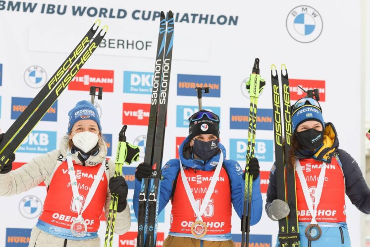 Eigentlich konnte man sich fast sicher sein, dass Dorothea Wierer, die mit großem Vorsprung zum entscheidenden Schießen kam, einem sicheren Sieg entgegen läuft. Als die zweimalige Gesamtweltcupsiegerin zwei Scheiben verfehlte, war die Tür für ihre Verfolgerinnen weit offen. Keine nutzte die Chance und während in der Strafrunde Hochbetrieb herrschte, übernahm die Französin Julia Simon, die mit 47,0 Sek. Rückstand an den Schießstand kam, die Führung. Aber auch Franziska Preuß blieb fehlerfrei und ging hinter der Französin auf die Schlussrunde. Bei der ersten Attacke zog Preuß an Julia Simon vorbei, die aber ließ nicht locker, konterte und rettete den Sieg mit letzten Kräften 3,9 Sek. vor Franziska Preuß ins Ziel. „Ich habe am Birxstieg gemerkt dass sich die Julia auch nicht so leicht tut, ich habe alles probiert was ich kann, dass ich dran bleibe, aber die Julia war zu stark für mich. Ich bin froh über den zweiten Platz. Es war trotzdem ein schönes Rennen, auch wenn es hart war“, so Franziska Preuß nach dem Rennen in der ARD. Auch der dritte Rang war hart umkämpft und hier setzte sich die Schwedin Hanna Oeberg knapp gegen die Norwegerin Ingrid Landmark Tandrevold durch. Mona Brorsson wurde Fünfte vor Dorothea Wierer. Lisa Theresa Hauser war ebenfalls mit nur 6,0 Sek. Rückstand in aussichtsreicher Position vom Schießstand weggelaufen und in ihrer derzeitigen Verfassung hätte sie durchaus einen Podestplatz erreichen können. Nach einem Sturz in einer Abfahrt verlor sie fünf Plätze und kam auf Rang 12. Denise Herrmann belegte nach vier Strafrunden und der schnellsten Gesamtlaufzeit Rang 15, Janina Hettich Rang 18. „Die Ansprüche sind schon gestiegen, weil man sieht wo es hingehen kann, aber nichts destotrotz bin ich mit dem 18. Rang zufrieden. In dem engen und starken Feld darf man sich keinen Fehler erlauben und mit zwei Fehlern Platz 18 das ist noch ganz in Ordnung,“ so Janina Hettich nach dem Rennen. Maren Hammerschmidt, die sich für den Massenstart nach dem Sprintergebnis von Oberhof qualifiziert hat, verfehlte vier Scheiben und ist läuferisch noch nicht bei ihrem Leistungsvermögen angekommen. Am Ende belegte sie Rang 29.