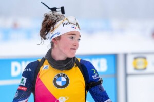 Franziska Preuß gelang im Liegen eine perfekte Serie, kam in aussichtsreicher Position zum Stehendanschlag und kassierte eine Strafrunde. „Der Rhythmus war nicht langsam. Vielleicht war das Risiko zu hoch, ich habe schon gewusst ein Fehler ist zu viel für ein Top-Ergebnis,“ so Franziska Preuß zu ihrem Schießen nach dem Rennen. Mit der fünften Zeit kam sie in die Schlussrunde und brachte diese Position 2,4 Sekunden vor Janina Hettich-Walz ins Ziel. Die Strecke sei nicht ohne, meinte Preuß, und dass ihre Ausgangslage definitiv gut sei für die Verfolgung am Sonntag. Ihr Rückstand auf die Siegerin beträgt 47,1 Sekunden, also bei vier Schießeinlagen definitiv machbar um Richtung Podest zu laufen.
