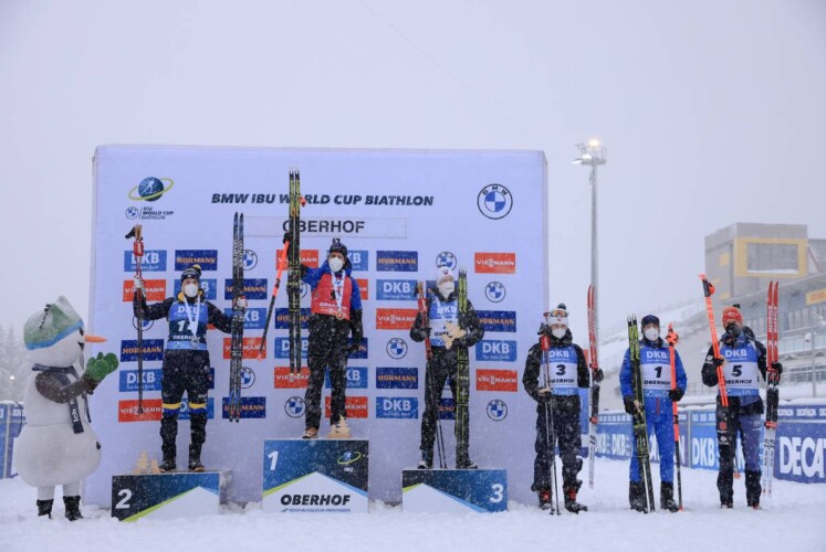 Auf der Runde zum entscheidenden Schießen lieferte sich Erik Lesser im Sandwich zwischen den beiden Franzosen Emilien Jacquelin im gelben und Quentin Fillon-Maillet im roten Trikot ein beachtliches Rennen aber eben mit deutlichem Rückstand auf den in Führung liegenden Russen. Das Tempo der drei Verfolger sah eher nach taktieren als nach Angriff aus. Mit knapp einer Minute Vorsprung kam Alexandr Loginov zum entscheidenden Schießen und setzte die ersten beiden Schüsse ins Ziel, die drei weiteren verfehlte er. Nun lag es an den Verfolgern die Chance zu nützen. Quentin Fillon-Maillet setzte sich nach einer perfekten Serie an die Spitze. Auch Sebastian Samuelsson räumte sicher ab und ging als nächster auf die Schlussrunde, während Alexandr Loginov noch immer in der Strafrunde kreiselte. Erik Lesser und Emilien Jacquelin mussten riskierten um noch eine Podestchance zu wahren, wurden aber nicht belohnt und kassierten jeweils zwei Strafrunden. Alexandr Loginov kam auf Rang drei positioniert aus der Strafrunde, aber nur 2,5 sek. dahinter sortierte sich der Norweger Sturla Holm Laegreid ein. Roman Rees setzte im letzten Schießen nochmals fünf Treffer und lag bei Schießstandausgang an achter Position. Auf der Schlussrunde bot sich ein spannender Zweikampf zwischen Quentin Fillon-Maillet und Sebastian Samuelsson. Der Schwede gab den Kampf um den Sieg nicht auf, saugte sich an den Franzosen heran und kam immer näher. Dahinter entwickelte sich ein Dreikampf um den Bronzerang zwischen Alexandr Loginov, Sturla Holm Laegreid und Tarjei Boe. Auf dem letzten Kilometer gingen die beiden Norweger an Alexander Loginov vorbei und dem Russen fehlten die nötigen Körner zu einem Gegenangriff. An der Spitze hatte sich Quentin Fillon-Maillet in der „Henkelschleife“ entscheidend von seinem Verfolger abgesetzt und die Ziellinie als Sieger überquert mit 9,9 Sek. Vorsprung vor Sebastian Samuelsson. Tarjei Boe sicherte sich den dritten Rang nur 0,1 Sek. vor Sturla Holm Laegreid auf Rang vier und der Sprintsieger Alexandr Loginov kam auf Platz fünf. Roman Rees, Fabien Claude und Erik Lesser lieferten sich einen packenden Kampf um den sechsten Rang mit dem besseren Ende für Roman Rees, der auf Rang sechs bester Deutscher wurde. Rees reist mit einem guten Wochenende im Gepäck nach Ruhpolding. „Für mich hat es hier jedes Mal richtig gut geklappt, konnte auch in den Schlussrunden läuferisch was drauf setzen, hatte keinen Fehler stehend auch bei schwierigen Bedingungen, das motiviert natürlich“, so Roman Rees nach dem Rennen.