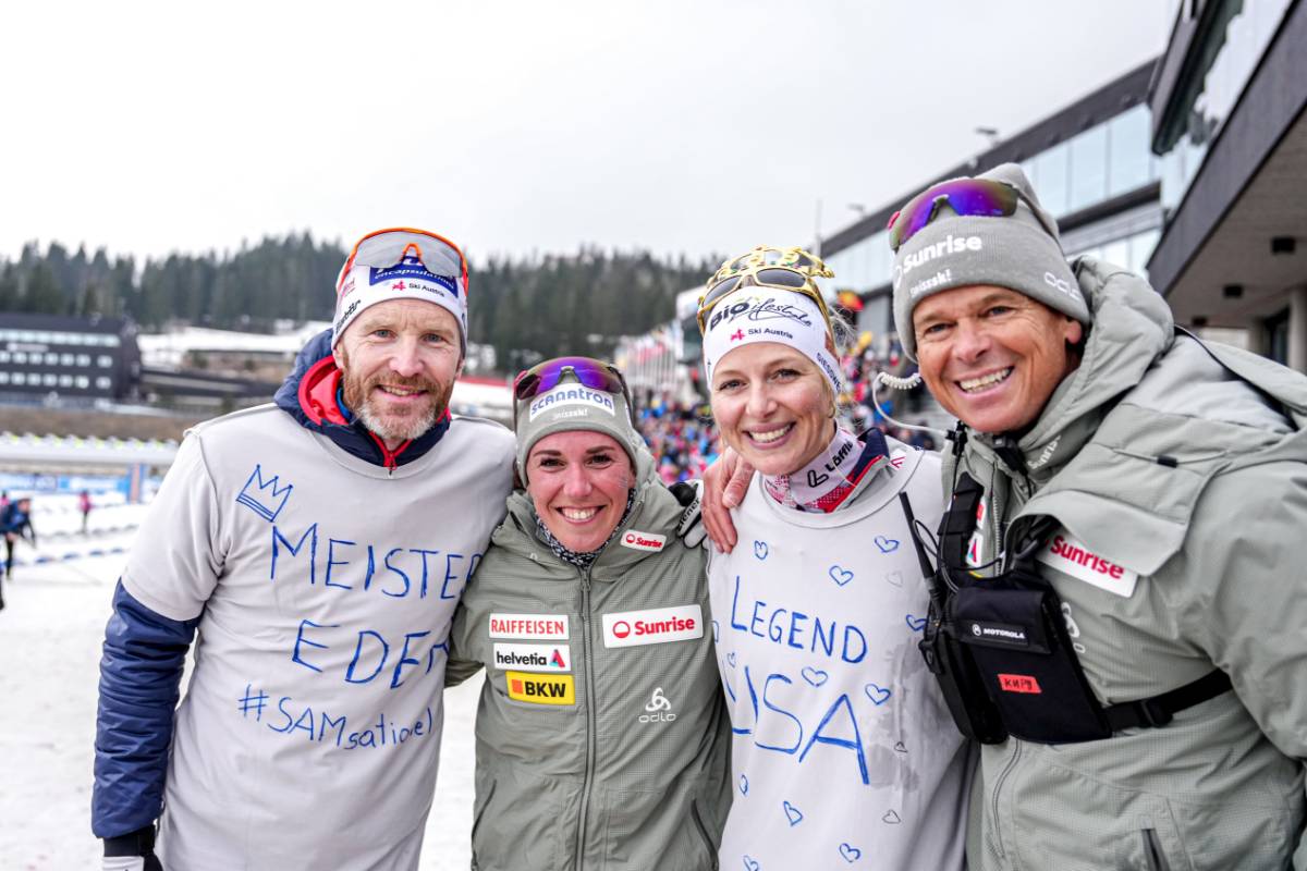 Simon Eder (AUT), Lena Haecki-Gross (SUI), Lisa Theresa Hauser (AUT), Andreas Kuppelwieser (ITA); coach Team Switzerland, (l-r) © Nordnes/NordicFocus