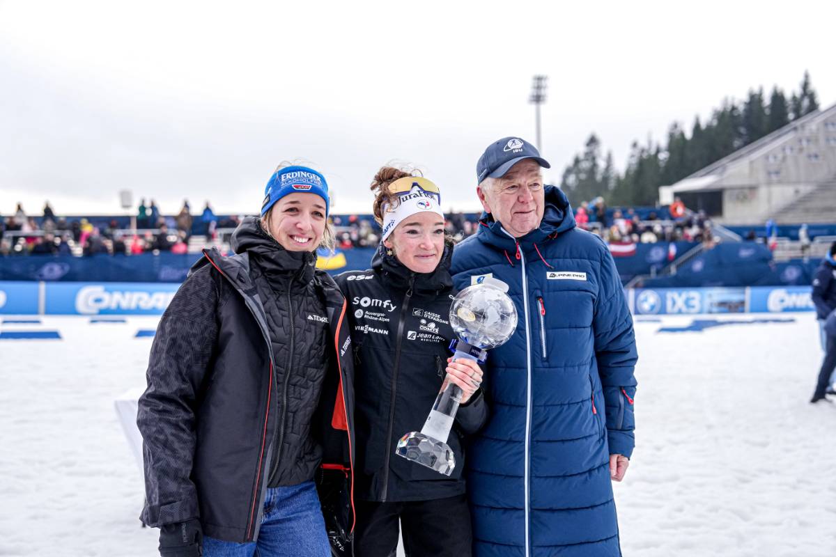 Franziska Preuss (GER), Lou Jeanmonnot (FRA), Olle Dahlin (SWE); IBU President, (l-r) © Nordnes/NordicFocus