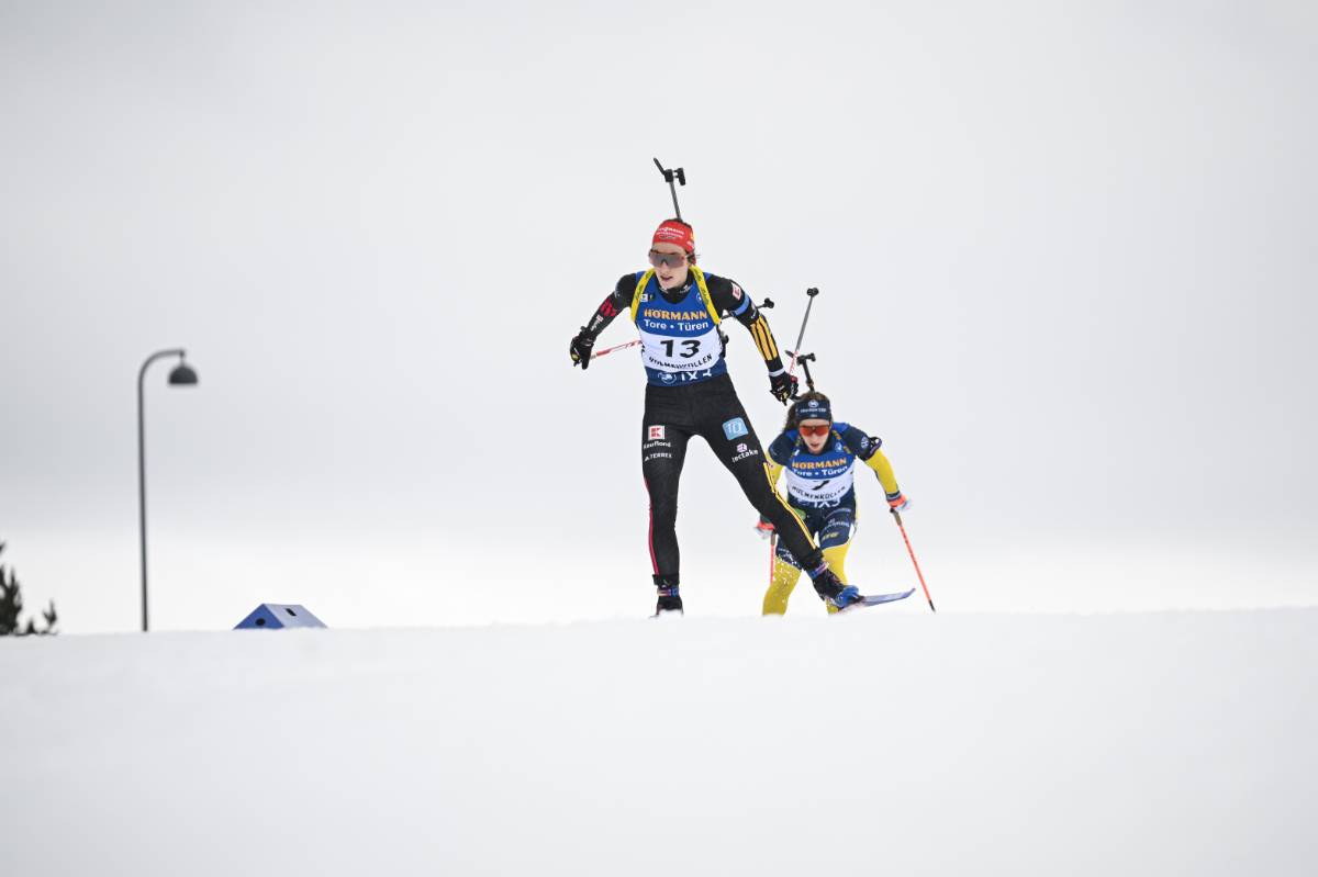 Fünf Mal war die Runde über 2,5 km zu laufen und dazwischen mussten vier Schießeinlagen absolviert werden. Es windete ordentlich als die 30 Athletinnen zum ersten Anschlag kamen. Julia Simon war als Erste fertig, gefolgt von Hanna Oeberg, Oceane Michelon und Lou Jeanmonnot. Janina Hettich-Walz war aus dem deutschen Team als Erste mit fünf Treffern durchgekommen und sortierte sich als Siebte ein. Die anderen Deutschen begannen mit Strafrunden, Julia Tannheimer sogar mit zwei und ihr Rückstand betrug eingangs der zweiten Runde bereits 1:03 Minuten. Die Streckenbedingungen war zu diesem Zeitpunkt noch fest und gut. In der Loipe hielt sich Hanna Oeberg im Windschatten von Julia Simon und mit einer kleinen Lücke zu ihren Verfolgerinnen machten sich beide zum zweiten Schießen, ebenfalls im Liegen, bereit.
