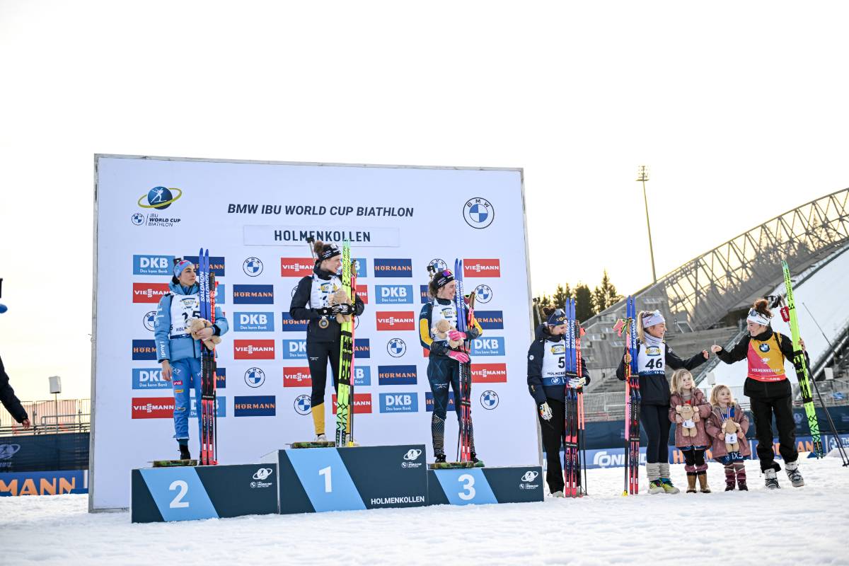 Neben Vanessa Voigt hat es auch Julia Tannheimer in die Verfolgung geschafft. „Ich will immer alles geben,“ sagte sie am ZDF-Mikrofon. „Ich habe heute versucht die erste Runde schneller zu laufen, in Otepää hat es mich sehr genervt, dass ich da so viel verloren habe, das habe ich heute aber auf der letzten Runde büßen müssen. Das muss ich noch lernen,“ gab Tannheimer zu die auch erklärte, dass gerade eine tiefe Spur die Abfahrten noch viel schwieriger macht. Janina Hettich-Walz erklärte, dass sie wusste was auf der Strecke auf sie zukommt. „Die letzten Tage durften wir nicht auf die Strecke und wir konnten auch nicht schießen.“ Ich bin schlecht ins Rennen rein gekommen, zwei Fehler stehend ist mindestens einer zu viel. Stehend bin ich diese Saison einfach extrem wackelig, ich habe es nicht hingekriegt, meine Waffe ruhig zu bekommen, aber vielleicht gelingt es mir in der Verfolgung besser.“ Selina Grotian traf liegend eine Scheibe nicht, im Stehen hielt sie sich schadlos und erinnert sich noch an ihren Sturz dort im letzten Jahr. „Ich weiß, ich hätte in der Abfahrt noch ein bißchen besser fahren können, aber jeder der schon mal auf Langlaufskiern gestand hat, der weiß, wie schwierig solche Abfahrten sein können.“ Am Ende belegte Selina Grotian Platz 26. Julia Kink (1:0) überquerte als letzte der deutschen Starterinnen die Ziellinie als 38. „Beim Einlaufen war es noch recht gut (die Strecke), aber mit meiner späten Startnummer war es schon ganz schön tief.“ Für Marlene Fichtner war es das erste Rennen am traditionsreichen Holmenkollen und nachdem sie erst am Wettkampftag zum ersten Mal die Runde besichtigen konnte, zeigte sie sich zufrieden mit ihrem Rennen. „Ich glaube ich habe das Beste daraus gemacht. Ich habe versucht konsequent an die Sache ranzugehen. Der letzte Schuss ist mir einfach weggegangen.“