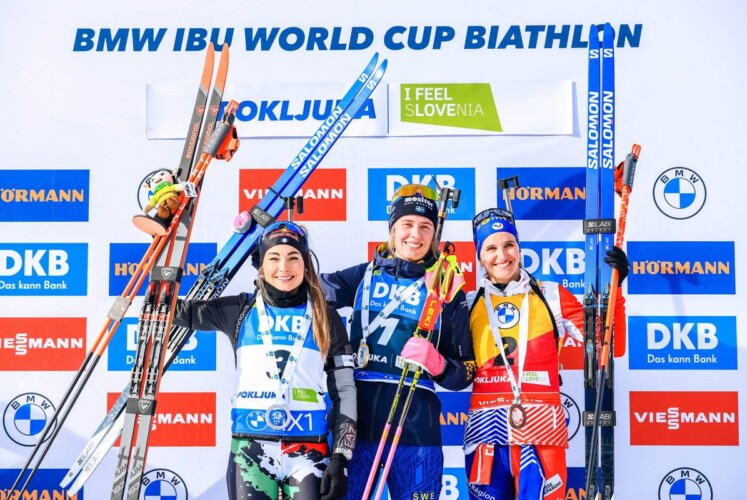 Elvira Oeberg war die Gejagte aus dem Sprint, aber nur 6,9 Sek. hinter ihr ging die Französin Julia Simon in die Spur. Letztere siegte bereits in zwei von drei Verfolgungsrennen und wurde einmal Dritte. Sie ist als sichere Schnellschützin bekannt und war damit auch Favoritin bei der Verfolgung auf der Pokljuka. Aber gegen die Schwedin hatte Julia Simon heute keine Chance. Oeberg lief ihr Tempo an der Spitze, räumte vier Mal sicher ab und holte einen perfekten Start-Ziel-Sieg. Dorothea Wierer traf von den zwanzig Scheiben neunzehn und wurde mit 17,6 Sek. Rückstand Zweite. Rang drei sicherte sich schließlich die Französin. Nach zwei Strafrunden kam sie 4,8 Sek. hinter Wierer ins Ziel. Die Slowakin Paulina Batovska-Fialkova wurde wie im Sprint auch in der Verfolgung Vierte, vor der Tschechin Marketa Davidova und der Schwedin Linn Persson auf Rang sechs.