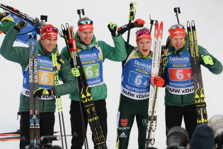 Auch ohne Simon Schempp und Erik Lesser, die beide nicht in Ruhpolding antreten, hat es die deutsche Staffel mit Roman Rees, Johannes Kühn, Arnd Peiffer und Benedikt Doll aufs Podest geschafft. Durch die geschlossen gute Mannschaftsleistung wäre auch der Sieg möglich gewesen, aber gegen Johannes Thingnes Boe, den Überflieger aus Norwegen, mit acht Siegen in Einzelbewerben, hatte Benedikt Doll auf der Schlussrunde keine Chance. Roman Rees hatte als Startläufer seine Sache hervorragend gemeistert. Sowohl liegend als auch stehend alle Scheiben ohne Nachlader abgeräumt und mit 1,1 Sek. Rückstand auf Johannes Kühn gewechselt. Nach einem Nachlader im liegenden Anschlag machte Kühn es wieder einmal spannend, als er mit seinem dritten Nachlader die Strafrunde vermeiden konnte. Auf seiner Schlussrunde machte er 10 Sek. gut und wechselte als Siebter mit 29.3 Sek. Rückstand auf Arnd Peiffer, der nach tadelloser Leistung am Schießstand zusammen mit Dominik Landertinger auf den in Führung liegenden Tarjei Boe aufschließen konnte. Die Schlussläufer für Norwegen, Deutschland und Österreich gingen gemeinsam ins Rennen, gefolgt von Schweden, Tschechien, Frankreich und Russland.