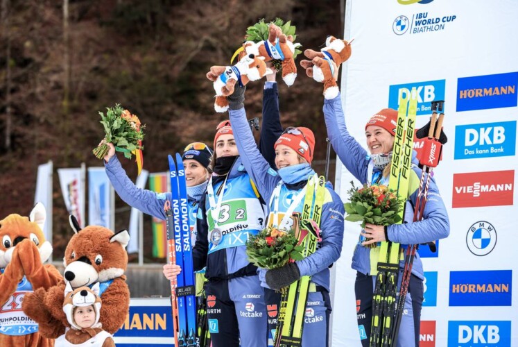 Frankreich lag auch beim dritten Wechsel in Führung, 27 Sek. betrug der Vorsprung vor Italien, wo die junge Rebecca Passler ins Rennen ging. 9 Sek. später kam Norwegen und als Vierte wechselte Vanessa Voigt auf Sophia Schneider, die ca. 10 Sek. hinter der Norwegerin Marte Olsbu Roeiseland startete. Sophie Chauveau baute ihren Vorsprung auf die Norwegerin aus und Marte Olsbu Roeiseland kam der Italienerin immer näher. Sophia Schneider hatte es mit der starken Tschechin Marketa Davidova zu tun. Sophie Chaveau, die bei den Heimrennen im französischen Le Grand Bornand ihren Durchbruch hatte, begann mit Fehler und ein zweiter folgte. Ihre Schüsse waren knapp vorbei und erst mit dem letzten ihrer drei Nachlader hat sie die Strafrunde vermieden. Allerdings traf Marte Olsbu Roeiseland neben ihr die Scheiben sicher und schnell und war nun dicht an der Französin dran. Die Italienerin Rebecca Passler kam mit einem Nachlader gut durch und hielt sich auf der dritten Position mit 7,3 Sek. Rückstand auf die Spitze. Sophia Schneider benötigte zwei Nachlader und hatte 38,6 Sek. Rückstand auf die Führende, lag an vierter Position und wurde von der Tschechin Marketa Davidova attackiert, aber Schneider hielt ihre Position. Marte Olsbu Roeiseland und Sohie Chauveau kamen gemeinsam zum Stehendanschlag und während die Norwegerin sicher abräumte, verfehlte Sophie Chauveau zwei Scheiben, traf auch mit den Nachladern nicht und kassierte zwei Strafrunden. Rebecca Passler traf die fünf Scheiben in einer sensationellen Schießzeit von 19,6 Sek. und war erste Verfolgerin von Marte Olsbu Roeiseland. Die Tschechin Marketa Davidvoa folgte nach fünf Treffern an dritter Position, dann kam Elisa Gasparin für die Schweiz und nach weiteren zwei Nachladern kam auch Sophia Schneider zurück auf die Strecke, an fünfter Position mit 6 Sek. hinter Gasparin. Rebecca Passler konnte das Tempo von Roeiseland auf der Schlussrunde nicht mitgehen, aber Sophia Schneider lief flog auf der Schlussrunde, holte sich erst die Schweizerin und dann auch noch die Tschechin. „Heute musste ich mir das Rennen nicht einteilen, weil es von Anfang an richtig gut ging,“ so Sophia Schneider im ARD-Interview nach dem Rennen. „Die Zuschauer haben einen so angetrieben, da musste ich aufpassen, dass ich nicht überpace. Das Schießen hätte man besser machen können. Zwei Fehler sind zu viel, auch wenn man Nachlader hat. Sverre (Olsbu Roeiseland) sagt immer: ‚breathe! und dann ‚take the last shot‘ und so habe ich noch einmal durchgeatmet und getroffen. Ich habe gemerkt, dass heute etwas geht, darum bin ich das Rennen auch aggressiv angegangen“.