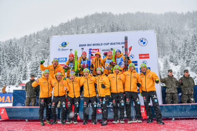 Beim Biathlon Weltcup in Hochfilzen gelingt der deutschen Damenstaffel mit Vanessa Voigt, Julia Tannheimer, Selina Grotian und Franziska Preuß ein großartiger Erfolg. Mit insgesamt nur vier Nachladern hat das Team vor allem am Schießstand perfekt gearbeitet und schließlich mit einem Vorsprung von 1.05,7 Minuten vor Frankreich mit Julia Simon, Justine Braisaz-Bouchet, Sophie Chauveau und Lou Jeanmonnot gewonnen. Die französische Schlussläuferin kassierte unter der Drucksituation beim letzten Anschlag eine Strafrunde und hatte keine Chance mehr auf den Sieg (1 Strafrunde/13 Nachlader). Schweden mit Anna Magnusson, Anna-Karin Heijdenberg, Ella Halvarsson und Elivra Oeberg (1 Strafrunde/6 Nachlader) setzte sich im letzten Anschlag durch die Schlussläuferin der Schweiz durch und komplettierte das Podest. Slowenien kam mit sechs Nachladern auf Rang vier ins Ziel vor der Schweiz mit Amy Baserga, Aita Gasparin, Lena Häcki-Groß und Elisa Gasparin. Die schweizerische Schlussläuferin lag auf Podestkurs und hat wie Frankreich im entscheidenden Schießen eine Strafrunde kassiert. Am Ende wurden sie Fünfte (1 Strafrunde/10 Nachlader) vor Norwegen auf dem sechsten Rang. Juni Arnekleiv, Karoline Offigstad Knotten, Gro Randby und Maren Kirkeeide hatten im Ziel einen Rückstand von 3:08,2 Minuten nach 2 Strafrunden und elf Nachladern. „Alle drei Mädels vor mir haben schon so einen super Job gemacht. Der Sieg ist für uns alle vier, für die Techniker, die bei den Bedingungen einen super Job gemacht haben. Ich glaube, da freuen sich heute alle für uns,“ sagte eine strahlende Franziska Preuß nach dem Rennen und bedankte sich, dass knapp 10.000 Zuschauer in Hochfilzen im Stadion und an der Strecke das Team anfeuerten. „Wir nehmen das gerne mit, dass wir so angefeuert werden. Es ist ein sehr schönes Gefühl. Der Tag wird sich bei den Youngsters einbrennen.“