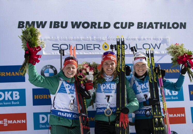 Denise Herrmann hat die Verfolgung der Damen mit 4,2 Sek. Vorsprung vor Franziska Hildebrand gewonnen. Als Siebte ins Rennen gestartet hatte sie sich bei den beiden liegenden Anschlägen besonders viel Zeit gelassen um die Strafrunde zu vermeiden, verfehlte bei den stehenden Anschlägen jeweils eine Scheibe und ging 11,9 Sek. hinter Franziska Hildebrand auf die Schlussrunde. Auch Hildebrand verfehlte beim finalen Schießen eine Scheibe, aber alle Verfolgerinnen mit Ausnahme der Finnin Kaisa Mäkäräinen patzten ebenfalls und so gingen die beiden Deutschen aus der Strafrunde kommend in Führung. Herrmann lief auf der Schlussrunde an ihre Teamkameradin heran und konnte aus dem Windschatten auf den letzten Metern an Hildebrand vorbeigehen. Im ZDF-Interview sagte Franziska Hildebrand: „Ich wusste, dass es hart wird gegen Denise auf der letzten Runde und ich habe versucht alles aus mir rauszuholen“. Denise Herrmann hat endlich ihre Trainingsleistung am Schießstand im Wettkampf umsetzen können und war glücklich über ihren dritten Weltcupsieg. Die läuferische Form passte immer, auch heute war keine schneller als sie, aber nun scheint im Hinblick auf die Weltmeisterschaften in knapp drei Wochen auch der Knoten am Schießstand geplatzt zu sein. Nach dem Rennen sagte sie: „Das Schießen war heute die Grundlage und ich habe mir Zeit und Sekunden liegen gelassen, aber gerade die Null im Liegen war mir wichtig. Ich habe mich von Schießen zu Schießen gehangelt und es war ein hartes Stück Arbeit. Wenn wir jetzt mit den Waffen heim kommen, dann kann bei der WM nichts schief gehen“. Auch wenn Denise Herrmann am Schießstand Zeit Franziska Preuß scheint nach der überstandenen Kehlkopfentzündung langsam wieder zu ihrer Form zu finden. Als 50. ins Rennen gegangen kam sie mit der neunten Laufzeit nach zwei Strafrunden als 28. ins Ziel und bekundete im Interview „Ich werde jetzt keinen Tag mehr verschenken, voller Fokus auf die WM“. Kaisa Mäkäräinen lief nach drei Strafrunden mit 16,5 Sek. Rückstand auf den dritten Rang. Sie hat in dieser Saison bereits die Verfolgung in Pokljuka und auch in Hochfilzen gewonnen.