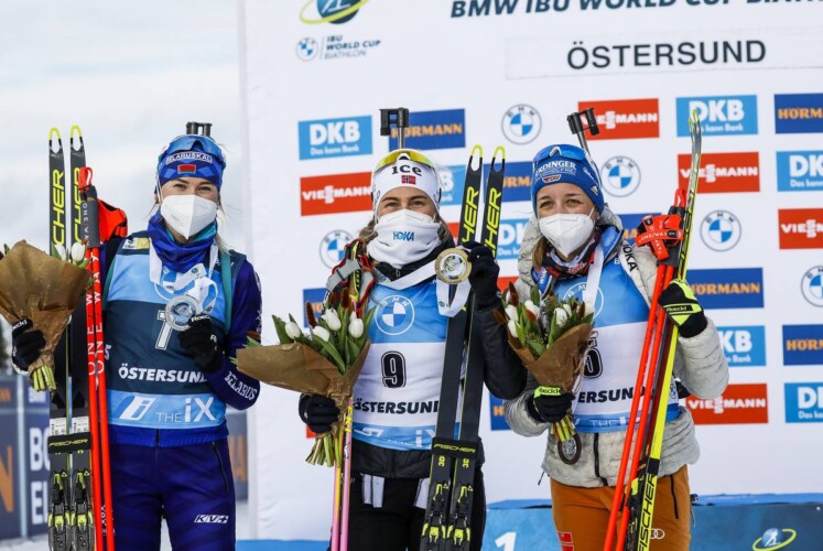 Die Norwegerin Ingrid Landmark Tandrevold begann mit einer Null, kassierte in der Folge fünf Extrarunden, kam als Siebte zum finalen Schießen und ging 5,1 Sek. hinter Dzinara Alimbekava auf die Schlussrunde. Tandrevold war in der Spur deutlich schneller als Alimbekava, ging vorbei und holte sich mit 6,9 Sek. Vorsprung den Sieg vor Alimbekava auf Rang zwei. Dahinter entpuppte sich ein weiterer Zweikampf um Rang drei zwischen Franziska Preuß und Lena Haecki. Preuss kam nur 3,5 Sek. hinter der Schweizerin aus der Strafrunde, stürmte an Haecki vorbei, die schließlich abreißen lassen musste. Die Deutsche holte sogar noch auf Alimbekava auf, schob sich immer dichter heran, aber am Ende fehlten 7 Sek. auf den zweiten Rang, der Franziska Preuß auch die kleine Kristallkugel gebracht hätte. Sie wusste während des Rennens nicht, dass es so eng im Kampf um die Kugel war und meinte nach dem Rennen: „Das ist jetzt blöd, hätte ich das gewusst, wäre vielleicht noch etwas gegangen,“ und zu dem Rennen meinte sie: „Das war echt ein sehr verrücktes Rennen. Nach dem ersten Stehend bin ich erst einmal gekreiselt und hab mir gedacht, was war das jetzt. Ich habe versucht mich nochmal zu sammeln, aber verrückt, dass man mit sechs Fehlern noch aufs Podium laufen kann.“ In der Gesamtweltcupwertung hat Preuß ebenfalls noch einen Sprung nach vorne geschafft und wurde Dritte hinter den beiden Norwegerinnen Tiril Eckhoff und Marte Olsbu Roeiseland. Im Rennen platzierte sich Lena Haecki als Vierte vor der Russin Uliana Kaisheva und Hanna Sola aus Weissrussland. Tiril Eckhoff kam auf Rang sieben ins Ziel.