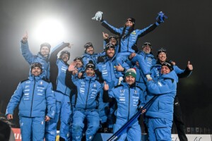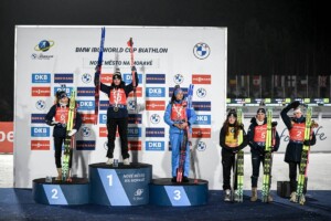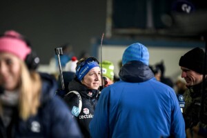 Zum ersten Stehendschießen hatte sich an der Spitze eine Fünfergruppe mit vier Französinnen und dazu die Italienerin Lisa Vittozzi formiert. Und jede von ihnen räumte die fünf Scheiben fehlerfrei ab. Julia Simon war die Schnellste und verließ den Schießstand in Führung liegend vor Oceane Michelon und Lisa Vittozzi. Lou Jeanmonnot bog wenige Sekunden dahinter ein und auch Bened hatte einen kleinen Abstand zu Jeanmonnot. Franziska Preuß traf ihre fünf Scheiben in 22,9 Sekunden und rückte auf die zwölfte Position vor, zusammen mit Dorothea Wierer. An der Spitze haben sich Vittozzi, Simon, Michelon und Jeanmonnot etwas von der fünften Dame, von Camille Bened, abgesetzt. Das Quartett vorne wechselte sich in der Führungsarbeit ab und eine davon dürfte bei drei Podestplätzen leer ausgehen. Die (Vor-)Entscheidung fiel im letzten Schießen. Zu viert standen sie aufgereiht und jede von ihnen traf die fünf Scheiben. Jetzt sollte die Entscheidung über die Podestplatzierungen erst auf der Runde fallen. Franziska Preuß kassierte noch eine Strafrunde und kam als Elfte zurück in die Schlussrunde.