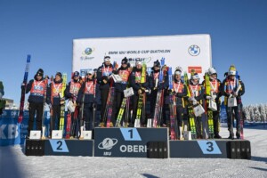 Die Schlussläufer aus Norwegen, Schweden und für Deutschland David Zobel machten Richtung Liegendschießen gemeinsame Sache, dahinter schob sich vor allem Eric Perrot für Frankreich und Tommaso Giacomel für Italien Meter für Meter an das Spitzentrio heran. David Zobel ging nach einem Nachlader in Führung, Samuelsson musste in die Strafrunde abbiegen und hinter Zobel reihten sich Vetle Sjaastad Christiansen (+ 8,2 Sek) und Eric Perrot (+8,6 Sek.) ein. Sebastian Samuelsson hatte an vierter Position 24,4 Sekunden Rückstand. Mit dem entscheidenden Schießen stand David Zobel wohl eine der größten Aufgabe in seiner Karriere bevor. „Mir war klar, ich habe gar nix zu verlieren. Auf dem Papier sind die alle stärker als ich, und dann auf eins übergeben zu bekommen“ so David Zobel. Christiansen und Perrot hatten zu ihm aufgeschlossen und auch der Schwede Samuelsson war weiter an das Spitzentrio herangelaufen. Frankreich, Norwegen, Deutschland war die Reihung am Schießstand. Frankreich begann mit Fehler, auch Zobel verpasste eine Scheibe während Eric Perrot eine weitere verfehlte blieben auch bei Norwegen zwei stehen. David Zobel traf mit dem ersten Nachlader nicht, erst der zweite kam ins Ziel. „Stehend war der Druck enorm. Der erste Nachlader muss halt drin sein, dann könnten wir jetzt ein Riesenfest feiern,“ so Zobel. Perrot ging als Erster vom Schießstand weg, 4,1 Sekunden dahinter Norwegen und dann david Zobel mit 7,9 Sekunden Rückstand nach ganz vorne. Hinter ihm nur 1,3 Sekunden später der Schwede und weitere 4,2 Sekunden hinter ihm Giacomel. Es war ein harter Kampf in der Spur, einmal war Norwegen an der Spitze, dann wieder Frankreich und dahinter war Schweden an Deutschland vorbeigezogen und Giacomel kam auch immer näher an David Zobel heran. Es entwickelte sich zum einem Fünfkampf auf der Schlussrunde, den Norwegen für sich entschied vor Frankreich und Schweden. Auf den letzten Metern zog Giacomel noch an Zobel vorbei sicherte seinem Team Rang vier vor Deutschland. „Einen Nachlader weniger oder wenn ich auf der Schlussrunde noch ein Mü hätte mehr geben können,“ sinierte Zobel nach dem Rennen und zog symbolisch seinen Hut (Mütze) vor dem Oberhofer Publikum.