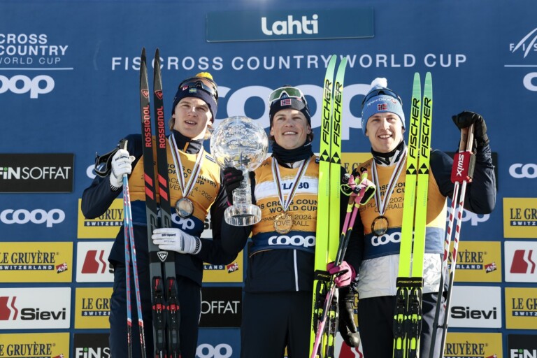 Podium Gesamtweltcup: Edvin Anger (SWE), Johannes Hoesflot Klaebo (NOR), Erik Valnes (NOR), (l-r) © Modica/NordicFocus