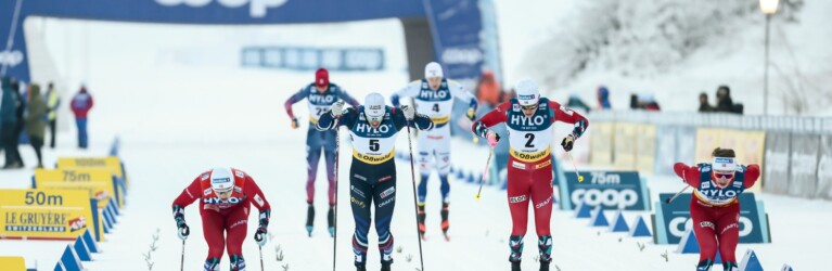 Erik Valnes (NOR), Lucas Chanavat (FRA), Johannes Hoesflot Klaebo (NOR), Ansgar Evensen (NOR), (l-r) im Zielsprint im Halbfinale © Modica/NordicFocus