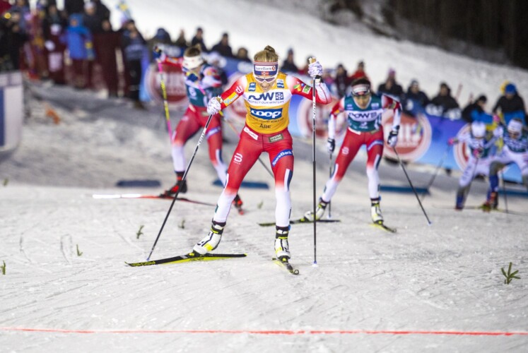 Auch im Finale blieb wieder alles beim Alten: Mit einer Reaktionszeit von 0,59 Sekunden war Johaug mit Abstand die langsamste am Start und hatte nach dem ersten kleinen Anstieg und der Steilkurve wieder einen kleinen Rückstand auf die ersten Fünf. Vorn bestimmten zunächst Linn Svahn und Jonna Sundling das Geschehen, gefolgt von Nadine Fähndrich im dritten Sprintfinale ihrer Karriere. Nun startete Johaug wieder ihren Angriff, nutzte eine Lücke in der Mitte, kurz danach ging links eine Lücke auf: Johaug lag nun Seite an Seite mit Heidi Weng und Astrid Uhrenholdt Jacobsen an der Spitze. Aber die Teamkolleginnen konnten Johaugs Tempo nicht mitgehen, so dass die Ski Tour-Führende mit klarem Vorsprung ihren ersten „Sprint“-Sieg ihrer Laufbahn einfuhr – bisher hatte sie einmal 2016 auf dem schwierigen Kurs in Oberstdorf als bestes Resultat den fünften Platz erreicht. Rang zwei ging an Heidi Weng, die in der Ski Tour 1:07 Minuten hinter Johaug liegt. Astrid Uhrenholdt Jacobsen sorgte für ein rein-norwegisches Podium. Jonna Sundling kam als Vierte ins Ziel und Linn Svahn und Nadine Fähndrich kämpften um Platz fünf, den sich schließlich die Schweizerin sicherte. Die 31-jährige Johaug jubelte ausgiebig über ihren Erfolg und lief im Ziel auf und ab, während die anderen fünf Athletinnen noch völlig erschöpft am Boden lagen. „Das war ein verrücktes Rennen. Wie man ja weiß, ich mag es, wenn es bergauf geht. Das war mein Tag! Das kann man jetzt nicht als Sprint bezeichnen, aber es ist schön, ganz oben auf dem Treppchen zu stehen. Ich bin sehr glücklich“, so Johaug.