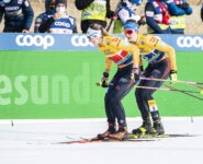 Trotz drei fehlenden Topnationen, von denen jeweils zwei Teamsprint Duos am Start gewesen wären, setzte Sebastian Eisenlauer seine Hoffnungen vor dem Teamsprint mit Thomas Bing sehr niedrig an: „Es wäre schön, wenn wir das Finale erreichen würden…“ Das gelang dem Duo dann auch, indem sie sich zu Beginn zurückhielten und dann in der zweiten Hälfte des Rennens Gas gaben und sich einen guten dritten Rang sicherten, da die Briten vor ihnen im Zielsprint stürzten. Im Finale hielt das deutsche Duo Bing/Eisenlauer dann gut mit und belegte schließlich den guten siebten Platz wie die Damen zuvor. Noch besser schlugen sich zu Beginn die jungen Schweizer Janik Riebli und Vize-Junioren-Weltmeister Valerio Grond, die sich immer bei den Teamkollegen in der vorderen Hälfte der Gruppe aufhielten, bis sie nach etwa der Hälfte des Rennens beim Wechsel stürzten und aussichtslos zurückfielen. Am Ende steht Platz zehn in ihrem ersten Finale im Weltcup zu Buche. Deutschland II mit Janosch Brugger und Anian Sossau schieden nach einem Sturz im Halbfinale aus und auch beide ÖSV Duos scheiterten, aber Benjamin Moser und Tobias Habenicht (AUT 2) reihten sich im Halbfinale vor den gestrigen Viertelfinalisten Lukas Mrkonjic und Michael Föttinger ein.