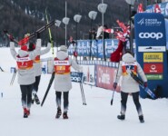 Platz acht wäre für Österreich, die das erste Mal eine Mixed-Staffel stellen konnten, generell ein tolles Ergebnis gewesen unabhängig vom Rückstand. Tatsächlich lag das Quartett, das mit Mika Vermeulen und Teresa Stadlober auf den Klassikpositionen offensiv aufgestellt war, aber kurz vor Schluss sogar noch auf einem Podestplatz! Zuvor begann das Rennen mit einem Malheur, einem Stockbruch von Vermeulen am Start, das aber keine große Auswirkung auf das Rennen hatte. In seiner zweiten Runde musste der Ramsauer dennoch einen Rückstand von 20 Sekunden und Platz elf zum Wechsel hinnehmen, aber Teresa Stadlober startete eine Aufholjagd und lief bis auf acht Sekunden an die beim Wechsel führende Finnin heran und übergab als Dritte an Benjamin Moser. Der Mauracher versuchte zunächst, sich dem Führungsduo anzunähern, aber Angers Tempo vorn war zu hoch, so dass er sich nach hinten orientierte und von Andersen einholen ließ. Mit dem Norweger ging der Sprinter dann problemlos mit, attackierte am letzten Anstieg und lief bis zum letzten Wechsel sogar zehn Sekunden Vorsprung heraus. Nun musste die unerfahrene Katharina Brudermann alles geben, aber nach einer Runde war die 25-Jährige eingeholt und schnell abgehängt. Dennoch schlug sich der Weltcupneuling sehr wacker und lag 1,5 Kilometer vor dem Ziel, bis dann die Gruppe an ihr vorbeizog. Platz acht ist ein tolles Ergebnis, das Hoffnung für künftige Mixed-Staffeln macht. „Dieses Top-Acht-Ergebnis ist für uns wirklich super. Mein Rennen ist zudem nicht ideal verlaufen, aber Teri (Anm. Teresa Stadlober) und Benni (Anm. Benjamin Moser) haben uns wieder gewaltig nach vorne gebracht. Im Vorfeld haben wir gesagt, dass wir, wenn alles super läuft, in die Top-Acht kommen können und das hat Katharina super ins Ziel gebracht. Jetzt haben wir das geschafft und sogar noch Reserven. Das war sicher ein sehr positiver Tag für den österreichischen Langlaufsport“, freute sich Mika Vermeulen und auch Teresa Stadlober war begeistert vom neuen Teamgefühl: „Der Teamspirit war heute einfach überragend und wir haben alle so mitgefiebert. Mika hatte am Anfang Pech mit dem Stockbruch, hat aber das Beste daraus gemacht und ich habe dann vom Start weg Vollgas gegeben. Ich konnte einige Plätze gutmachen, hatte zudem wieder super Material und habe mich auch richtig stark gefühlt. Benni ist nach mir dann ein unfassbar cooles Rennen gelaufen und auch Katharina hat bis zum Schluss super gekämpft. Auf diesen achten Platz können wir heute richtig stolz sein.“ Auch die beiden Skater waren selbstverständlich sehr zufrieden: „Es sind alle richtig gut gelaufen und wir sind absolut happy. Mir selbst ist es heute sehr gut gegangen, ich konnte mit dem Norweger super mithalten und am Schluss sogar noch einmal richtig attackieren. Das Material war wieder gewaltig.“ Für Weltcupneuling Katharina Brudermann war der tag etwas ganz Besonderes: „Dieses Staffelrennen war heute richtig cool und meine Teamkollegen waren einfach ein Wahnsinn. Ich bin kurz vor Schluss leider noch von ein paar Teams überholt worden, aber die Stimmung, der gesamte Teamspirit und dazu noch das Material waren richtig gewaltig. Ich war so nervös, als Benni als Zweiter an mich übergeben hat und dass ich heute ein Teil von dieser Staffel sein durfte, war einfach cool.“