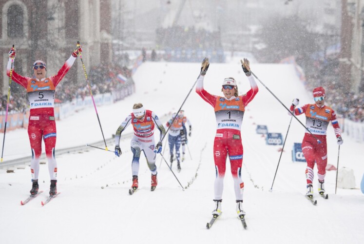 Das Rennen fand bei wolkigem Himmel und null Grad Celsius statt und der Kurs wurde seit dem letzten Jahr leicht verändert mit einer vergrößerten Schikane und einer zusätzlichen Welle in der Abfahrt, um das Tempo auf maximal 40km/h zu reduzieren. Auch die charakteristische Rampe auf den letzten zwei Metern vor dem Ziel fehlt, weil der Zielbereich diesmal schon etwas früher vor den Stufen der Kathedrale beginnt, so dass es ungewöhnlich flach ins Ziel geht. Pünktlich zum Finale der Damen begann es zu schneien, was sich aber beim Material offenbar bei niemandem negativ auswirkte. Drammen-Spezialistin Maiken Caspersen Falla gab wie üblich von Anfang an das Tempo vor und ging gefolgt von Stina Nilsson und Natalia Nepryaeva in die Abfahrt. Die Kurve unten erwischte Stina Nilsson besser und beide gingen Seite an Seite in den Schlussanstieg. Dort erwies sich wie in den voherigen Heats Maiken Caspersen Falla als die Stärkste und feierte ihren 19. Weltcupsieg. Die Norwegerin gewann allein fünf der letzten sechs Sprints in Drammen. „Der lange Anstieg zur Kirche liegt mir sehr gut. Das ist einer der Gründe, warum ich hier immer so gut bin. Mit diesen vielen Zuschauern ist das eines der Highlights in dieser Saison und man spürt die Liebe der Norweger zum Langlauf hier besonders“, meinte Falla und liegt im Sprintweltcup nur noch 13 Punkte hinter Nilsson. Die Schwedin verließen nach all ihrem Trainingsrückstand durch die Verletzung von Otepää am Ende die Kräfte und sie verpasste sogar noch das Podium. Stattdessen stürmte Astrid Uhrenholdt Jacobsen im Schlussanstieg von Platz vier nach vorne und jubelte über den zweiten Platz, der ihr bestes Sprintergebnis seit langer Zeit darstellt. Natalia Nepryaeva, die als Dritte des Halbfinals noch um ein Weiterkommen zittern musste, rettete sich als Dritte ins Ziel und liegt nun im Gesamtweltcup nur noch zwei Punkte hinter Ingvild Flugstad Østberg, die nur 19. wurde. Jessie Diggins und Anna Svendsen komplettierten das Finale als Fünfte und Sechste.