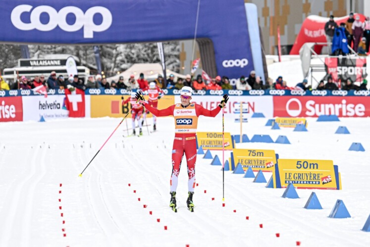 In der Spitzengruppe wechselte man sich gut ab und allen war klar, dass der Sieg nur über Klaebo gehen würde. Schon im Albrecht-Anstieg sorgte er für die Vorentscheidung und setzte sich von seinen Landsmännern ab. Nach weiteren 2,5 Kilometern als Solist mit bis zu 18 Sekunden Vorsprung lief er als ungefährdeter Sieger zu seinem 105. Weltcupsieg ein. Sein Trainingskollege Emil Iversen wurde starker Zweiter vor Harald Østberg Amundsen. „Das fühlt sich großartig an. Wir hatte tolle Ski. Mein Körper ist in guter Form, ich kam am Freitag aus der Höhe und es fühlt sich an als würde der Körper gut darauf reagieren. Nun gilt es, die Form für die nächsten zwei Wochen zu halten bis zu den Olympischen Spielen“, sagte Johannes Høsflot Klæbo, der das Goms sehr mag: „Das ist großartig hier. Wenn wir das doch in Norwegen hätten mit so viel Schnee und diesen großartigen Bedingungen. Das war toll und die Zuschauer sind es auch. Vielen Dank und ich hoffe, wir kehren bald ins Goms zurück.“ In der Verfolgergruppe holten sich die Norweger Platz vier und fünf, die kein Olympiaticket erhielten, nämlich Håvard Moseby und Andreas Fjorden Ree. Erik Valnes wurde Sechster vor Mattis Stenshagen und Savelii Korostelev. Der 22-Jährige, der in der Startphase wegen eines Stockbruches etwas durchgereicht wurde, schlug im Ziel wütend seinen Stock kaputt, nachdem er oben am letzten Anstieg noch Fünfter direkt hinter Moseby gewesen war. Mathis Desloges als zweiter Nicht-Norweger in den ersten beiden Gruppen konnte dem Tempo am Schluss nicht mehr folgen und belegte Rang neun.
