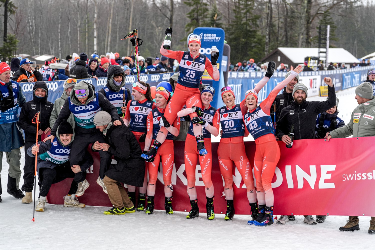 Wie Pia Fink mussten sich auch die Schweizerinnen Nadine Fähndrich und Anja Weber in Runde vier nach hinten verabschieden und Fähndrich beendete ihr letztes Rennen als 24. Anja Weber kam als 29. ins Ziel und feierte ihre Freundin, die vom Team mit einem großen Plakat „Danke, Nadine!“ begrüßt wurde. Die übrigen Schweizerinnen Marina Kälin, Lea Fischer und Alina Meier belegten die Positionen 41, 45 und 48. Magdalena Scherz als zweite Österreicherin wurde 47. Ebenfalls jubelnd von ihrem Team empfangen wurde Rosie Brennan, die im Alter von 37 Jahren ebenfalls ihre Ski an den Nagel hängt wie auch die Kanadierin Olivia Bouffard-Nesbitt.
