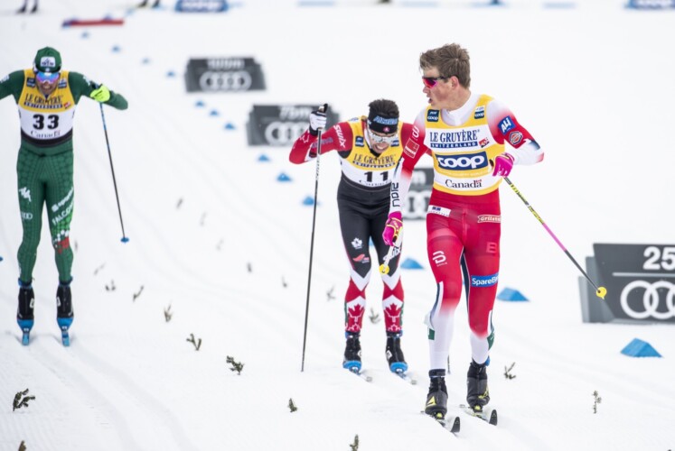 Alexander Bolshunov hätte heute die Unterstützung seiner Teamkollegen gebraucht, wie es die Norweger fabrizierten, die durch Iversen, Skar und Brandsdal in der ersten Rennhälfte immer in der Nähe von Klæbo waren und Iversen zeitweise als Bewacher von Bolshunov abstellten. Zum ersten Bonussprint nach 8,5 Kilometern erhöhte Alexander Bolshunov das Tempo und überquerte Seite an Seite mit Klæbo und Iversen die Linie – Platz eins ging an Klæbo vor Iversen und Bolshunov, der damit nur wenige Sekunden einbüßte. Danach blieb das Tempo hoch und immer mehr Athleten fielen aus der Hauptgruppe heraus, so dass nach zehn Kilometern noch 16 Athleten vorn dabei waren. Vier Kilometer vor Schluss wurde es richtig spannend: 400 Meter vor dem zweiten Bonussprint stürzte Klæbo, als er sich in der Innenkurve im Stadion selbst den Stock zwischen die Beine stellte. Bolshunov als einziger Russe vorn bekam nicht mit, was hinter ihm passierte: Der Norweger behielt die Nerven, schloss wieder auf und gewann sogar den Sprint. Zwei Kilometer vor dem Ziel dann die rennentscheidende und möglicherweise auch die für den Gesamtweltcup entscheidende Szene: Didrik Tønseth hielt das Tempo hoch, als Alex Harvey ihm zurief, das Tempo weiter zu verschärfen – genau in dem Moment, als ein russischer Betreuer mit Ersatzstock der Gruppe entgegenlief – der Stock konnte nur für Bolshunov sein! Beide wollen von den Problemen des Russen allerdings nichts bemerkt haben. „Ich sah, dass das Feld anfing, sich auseinanderzuziehen und ich wusste, dass Didrik stark ist. Er ist ein Mann, der sehr hart die letzten zwei Kilometer ins Ziel laufen kann, besser als Johannes und ich. Ich wusste, das würde mir helfen“, so Harvey. Tønseth hielt das Tempo in der nun fünfköpfigen Spitzengruppe so hoch, dass Bolshunov die kleine Lücke zwar fast wieder schließen konnte, er dann aber deutlich den Anschluss verlor. Auf der Zielgeraden ging dann alles seinen gewohnten Gang: Johannes Høsflot Klæbo war im Sprint nicht zu schlagen und führt nach der zweiten Etappe mit 52 Sekunden die Mini-Tour an. Alex Harvey jubelte in seiner Heimatstadt laut über den zweiten Platz, mit dem er so kurz vor seinem Karriereende offenbar gar nicht gerechnet hatte. Im Ziel war er in Tränen aufgelöst wie auch bei der Siegerehrung – sowohl beim Siegerfoto im Ziel als auch auf dem Podium nahmen ihm Klæbo und Tønseth in die Mitte. „Das hat sich Alex echt verdient. Es war ein tolles Rennen mit hoher Geschwindigkeit. Es hat Spaß gemacht und es ist schön, dass Harvey mit auf dem Treppchen steht. Ich freue mich für ihn. Morgen ist ein sehr wichtiges Rennen, ich brauche die Punkte. Aber heute war schon ein sehr, sehr guter Tag. Ein Rennen noch, dann werden wir unsere wohlverdiente Ruhe haben“, meinte der glückliche Sieger. „Es war ein schwieriges Jahr für mich. So ein Podium zu Hause herauszulaufen, das ist einfach unglaublich. Die Zuschauer haben mich durch das Rennen getragen. Ich hatte exzellente Ski und ich hatte viel Glück. Zwei oder dreimal bin ich fast gestürzt. Es gab einige Kollisionen. Der große Star war noch vor mir, aber ich bin Zweiter geworden und für mich ist das wie ein Sieg!“, meinte Harvey mit Tränen in den Augen. Die Probleme des Russe will er wie auch Klæbo nicht bemerkt haben – er gab das Kommando, das Tempo weiter zu verschärfen: „Ich sah, dass das Feld anfing, sich auseinanderzuziehen und ich wusste, dass Didrik stark ist. Er ist ein Mann, der sehr hart die letzten zwei Kilometer ins Ziel laufen kann, besser als Johannes und ich. Ich wusste, das würde mir helfen.“ Alexander Bolshunov büßte als Siebter hinter Francesco de Fabiani, Sjur Røthe und Emil Iversen auf der Strecke 17 Sekunden ein und verlor weitere 15 Sekunden durch den Bonussprint im Ziel. Gemeinsam mit Alex Harvey in dessen letztem Rennen wird er morgen versuchen, 52 Sekunden Rückstand aufzuholen, was auf dieser leichten Strecke gegen Johannes Høsflot Klæbo aber quasi unmöglich ist. Im Gesamtweltcup trennen die beiden nun 42 Punkte. „Shit happens“, brachte Markus Cramer die Sache auf den Punkt.
