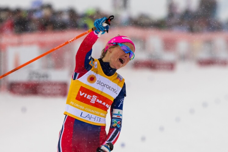 Es ist eine beeindruckende Bilanz: Mit 27 Jahren feierte Therese Johaug nun ihren 40. Weltcupsieg. Im Skiathlon ist sie seit mehr als vier Jahren ungeschlagen und es gab überhaupt nur einen Skiathlon in ihrer rund zehnjährigen Weltcupkarriere, bei dem sie nicht auf dem Podium stand. 43 Punkte hätten gereicht, um heute schon im Distanzweltcup alles klar zu machen, was sie schon fast unterwegs bei den beiden Zwischensprints erledigte. Zu diesem Zeitpunkt war Therese Johaug schon lange allein unterwegs: Direkt außerhalb des Stadions gab sie Gas und zunächst gingen mit Heidi Weng und Krista Pärmäkoski zwei Damen mit. Nach einem Kilometer war die Finnin bereits zurück in der Gruppe und fiel im Laufe des Rennens auch daraus zurück. Nach dem Ende des schweren Teilstücks von Runde eins musste auch Heidi Weng die Segel streichen und fortan ein einsames Rennen auf Position zwei laufen. Beim Skiwechsel lag der Rückstand nur bei 15 Sekunden, doch direkt anschließend erhöhte Therese Johaug das Tempo deutlich in den Anstiegen und baute den Vorsprung immer mehr aus bis auf eine Minute. „Es war ein toller Tag, ich mag die Strecke und vor allem die Anstiege. Das liegt mir und auch das Wetter kam mir entgegen. Ich hatte super Ski, alle haben einen guten Job gemacht und das war nicht leicht bei den Bedingungen. Ich habe gute Erinnerungen an Lahti und freue mich auf die Weltmeisterschaften nächstes Jahr“, sagte Therese. Die Gruppe dahinter bestand lange Zeit aus zehn Athletinnen – vor allem, weil Ingvild Flugstad Østberg und Maiken Caspersen Falla irgendwann keine Lust mehr hatten, die Tempoarbeit zu machen und deutlich rausnahmen. So war das Tempo in dieser Gruppe über mehrere Kilometer nicht allzu hoch und die Damen blieben zusammen. Das änderte sich auf der letzten Runde, als die Norwegerinnen das Tempo erhöhten und sich gemeinsam mit Riitta Liisa Roponen absetzten. Rang drei sicherte sich Østberg vor ihrer Teamkollegin, die Finnin jubelte über Platz fünf. Dieses Resultat war das beste Weltcupergebnis seit einigen Jahren, in denen sie auch oft im Skimarathon unterwegs war. Astrid Uhrenholdt Jacobsen und Kari Øyre Slind belegten die Plätze sechs und sieben vor Nathalie von Siebenthal und den Finninnen Anne Kyllönen und Krista Pärmäkoski.