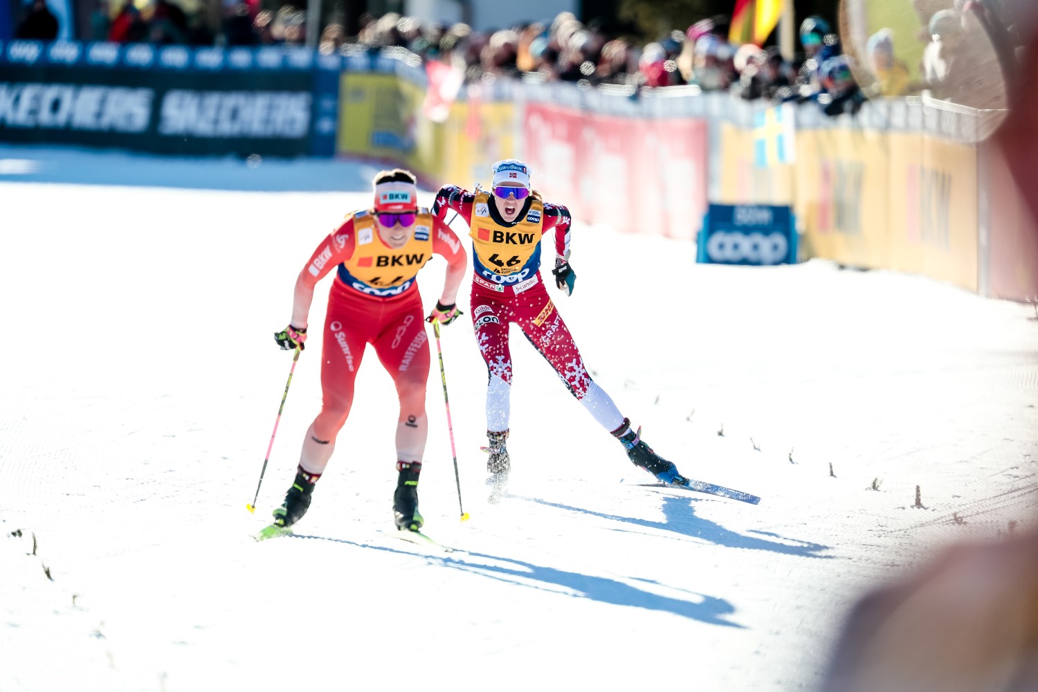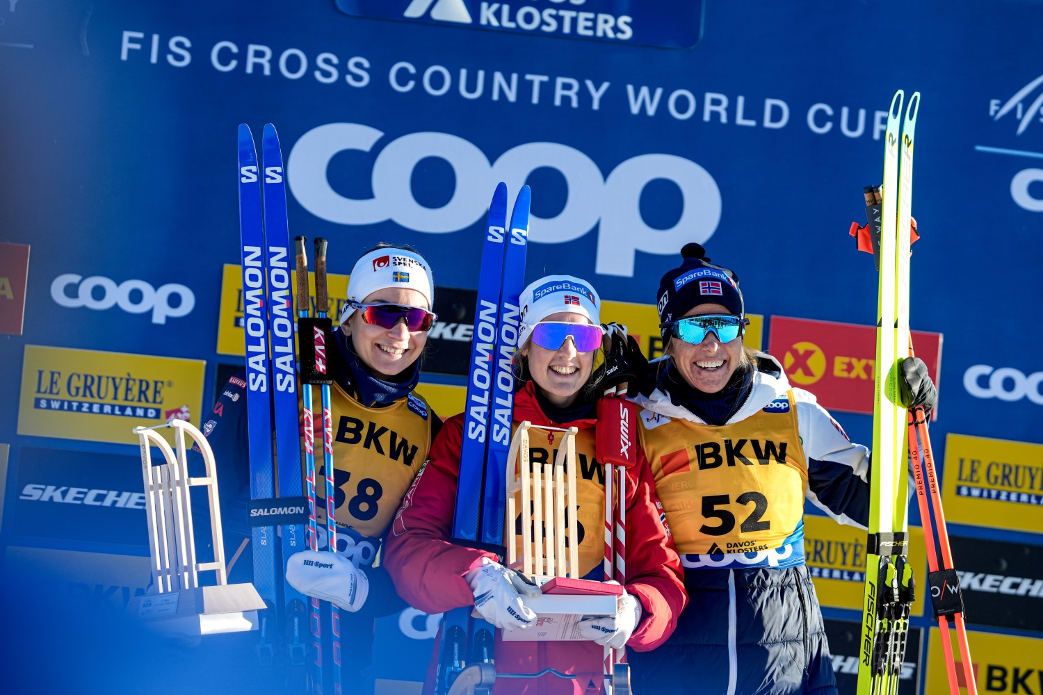 Die 28-Jährige ist in der Form ihres Lebens. Vor dieser Saison hatte Karoline Simpson-Larsen, die Lebensgefährtin von Biathlon-Durchstarter Johan-Olav Botn, Platz zehn als persönliche Bestleistung im Weltcup stehen und die in diesem Winter schon mehrfach unterbot und in allen vier Distanzrennen unter den besten Elf platziert war. Dass es heute noch besser werden würde, war schon früh zu sehen. Nach der ersten Runde lag sie bereits auf Kurs erstes Podium. Zu diesem Zeitpunkt lagen aber mit Astrid Øyre Slind, Simpson-Larsen, Moa Ilar, Léonie Perry und Jessie Diggins lagen zu diesem Zeitpunkt fünf Sportlerinnen innerhalb von 4,4 Sekunden. In der zweiten Rennhälfte sah weiterhin alles nach einem norwegischen Sieg in Abwesenheit der trainierenden Ebba Andersson und Frida Karlsson aus, aber Slinds minimaler Vorsprung schmolz in der Sonne des Bünda Stadions zusammen. Als sie die Linie überquerte, konnte Karoline Simpson-Larsen ihr Glück kaum fassen. Im Siegerinterview sagte die 28-Jährige, die wie Hedegart seit dem Frühjahr neu beim Team Anlegg Øst ist: „Ich bin geschockt, ich kann es nicht glauben. Es hat sehr viel Spaß gemacht, hier zu laufen. Ich habe mich stark, aber doch nicht so stark! Dieser Sieg bedeutet mir sehr viel und ich hoffe, es reicht für einen Platz bei den Olympischen Spielen.“ Mit 2,2 Sekunden Rückstand fiel Slind noch um 0,1 Sekunden hinter Moa Ilar zurück, die sich Platz zwei sicherte. Ein bockstarkes Rennen machte ihre Teamkollegin Maja Dahlqvist, die ihren Rückstand auf die Führende in der zweiten Runde noch von zwölf auf sechs Sekunden reduzierte und sich mit Platz vier belohnte. Jessie Diggins wurde Fünfte vor Léonie Perry, die freudestrahlend nach einem tollen Rennen im Leader’s Chair saß.