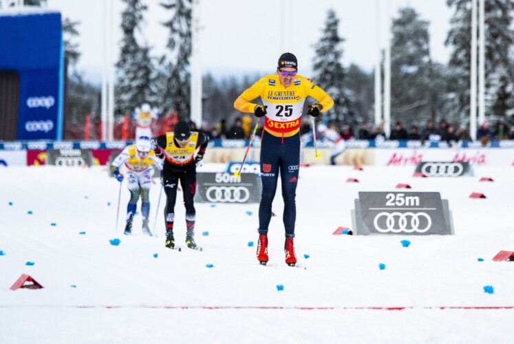 … über die Temperaturen in Ruka:Die Kälte spielt eigentlich keine Rolle, das sind wir gewohnt. Wir sind jetzt hier seit 14. November in diesen Gefilden unterwegs. Da war es öfters mal ein bisschen kälter und die Bedingungen waren vom ersten bis zum letzten Läufer gleich. Das ist schon mal was sehr Gutes und es waren auch die Materialbedingungen sehr gleichbleibend. Man hat ein bisschen den Vorteil gehabt, wenn man in die Runde gekommen ist, wo die Stärkeren dazugekommen sind, so dass man ein bisschen Windschatten hatte. Außer beim Jonas Dobler, der natürlich mit den Besten mitlaufen musste, und dem das sehr schwer gefallen ist, dem die Müdigkeit in die beine geschossen ist, hat das sonst keiner gehabt. Da kann man ein bisschen mehr Glück haben. Aber Kälte war sicher nicht das Problem. Das ist einfach eine sehr, sehr schwere Strecke und da ist egal, was für eine Temperatur ist, das ist immer hart.