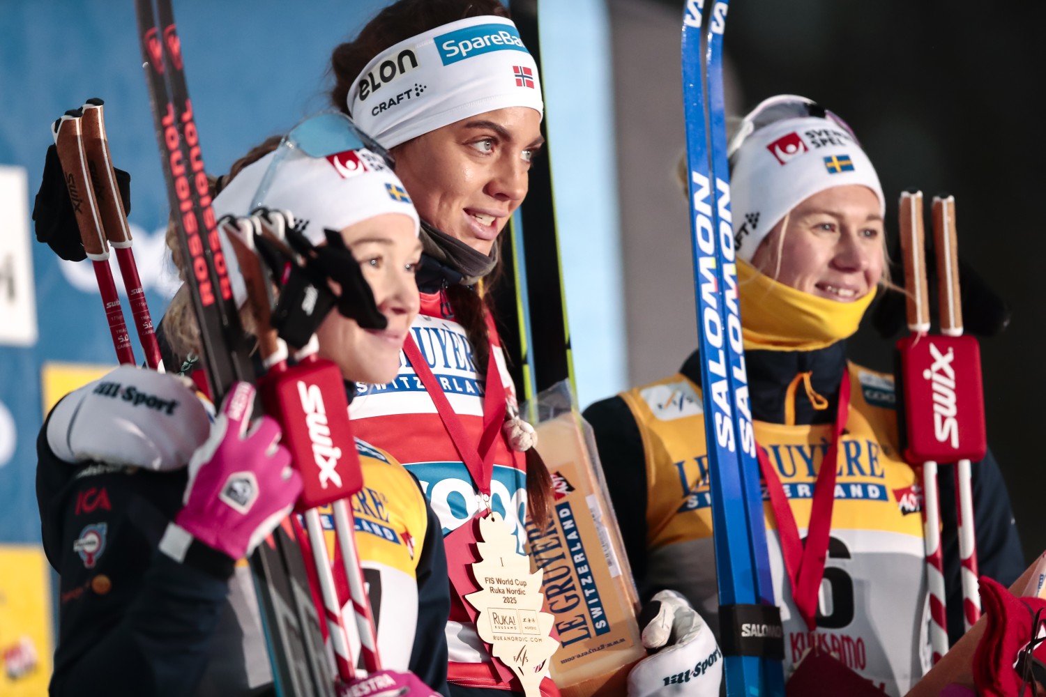 Einzelgängerin Kristine Stavås Skistad hat offenbar zu Hause in Konnerud sehr gut trainiert und erweist sich zum Saisonauftakt in Bestform, in der sie es auch mit den Schwedinnen aufnehmen kann. Nachdem sie im Prolog die elfte Zeit gelaufen war, überzeugte die 29-Jährige in den Heats, in diese eine gelbe Karte aus Beitostølen mitbrachte. Ebenfalls gelb vorverwarnt wie schon dreimal in den letzten vier Jahren reiste Emma Ribom aus Gällivare an und kassierte prompt als Siegerin ihres Viertelfinals eine weitere gelbe Karte wegen unsauberer Technik, so dass sie disqualifiziert wurde. Zuvor hatte die Schwedin die Heats nur als 30. erreicht und sprach nach dem Prolog zutiefst enttäuscht von einem „schlechten Tag“, der auch nicht mehr besser wurde. Skistad traf dann später im Finale auf drei von Riboms Teamkolleginnen, die aber hinter Skistad nur eine Nebenrolle einnahmen. Die Norwegerin hatte immer alles unter Kontrolle und attackierte im 116 Meter langen Schlussanstieg mit einer Durchschnittssteigung von 14%. Auf den letzten Metern nahm sie bereits das Tempo heraus und behinderte dadurch hinter ihr Maja Dahlqvist, die hart gegen Jonna Sundling um Platz zwei kämpfte. Bei gleicher Zeit ging der zweite Platz nach Auswertung des Zielfotos an Sundling. Skistad gab sich im Interview gewohnt wortkarg: „Das war ein guter Start. Es ist schön, die Schwedinnen zu besiegen.“ Auf Nachfragen nach dem Gefühl und ob sie Ruka mag, antwortete sie nur kurz mit „sehr gut“ und „ja“. Die Prolog-Siegerin und letztjährige Ruka-Gewinnerin Johanna Hagström musste sich nach Siegen im Viertel- und Halbfinale mit dem vierten Platz begnügen vor Nadine Fähndrich und Johanna Matintalo.