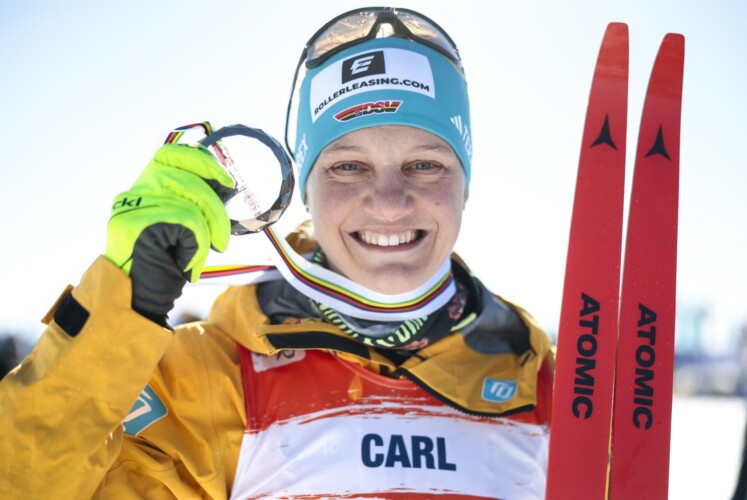 Eine wahre Sensation und ein Meilenstein in ihrer Karriere war neben Staffel-Silber der Olympiasieg im Teamsprint zusammen mit Katharina Hennig, nachdem Victoria noch auf der Zielgeraden im Doppelstockschub an Russland und Schweden vorbeigestürmt war. Damit trug sie maßgeblich zu den ersten deutschen Langlauf-Medaillen seit Sochi 2014 bei und Teamchef Peter Schlickenrieder konnte genau 20 Jahre nach seiner eigenen olympischen Silber-Medaille mit seinen Mädels über Gold jubeln. Nach Katharina Hennigs erstem Weltcupsieg arbeitete auch Victoria Carl immer mehr auf das erste Einzel-Podium hin, aber zunächst klappte es bei der WM in Planica wieder mit dem Team mit einer Silbermedaille. Die Thüringerin arbeitete verstärkt daran, ihre bestehenden Schwächen auszumerzen wie den Start und die Technik im klassischen Stil. „Meine Startschwäche im Sprint, wo ich immer schon einige Meter zurück hing, habe ich durch viele Motorikeinheiten mit den anderen Mädels verbessert. Auch meinen Diagonalschritt habe ich seit letztem Jahr super verbessert, da konnte ich mir von der Katha was abschauen, die da technisch super läuft, und ihren Schritt aufnehmen“, sagte sie. Aber auch im Kraftraum absolviert sie ein spezielles Training, das sich nun auszahlt. Im Podcast erzählte sie dazu: „Ich habe beim Training im Kraftraum was verändert und kann dadurch meine schnell zuckenden Muskelfasern besser behalten. Ich habe mein grundlegendes Krafttraining in einer sehr guten Physiotherapie, wo ich individuell auf mich und meine Schwächen abgestimmte Pläne kriege und wo ich in einem strominduzierten Krafttraining noch einmal mehr Muskelmasse anspreche bei den Übungen. Das greift dann so die muskulären Strukturen an, dass es für ordentlich Muskelkater sorgt. Einmal die Woche dieses strominduzierte Training, das ist mehr als genug.“ Damit ist nun auch ein Problem der Vergangenheit gelöst: „Weil ich eine sehr große Athletin bin, habe ich immer mit meinem Oberkörper viel rumgewackelt und mich verdreht und habe Energie verschwendet, die ich brauche und durch dieses Training, was auf meine Schwächen abzielt, kann ich auch viel stabiler im Oberkörper und in den ganzen Kniewinkeln meine Technik laufen.“