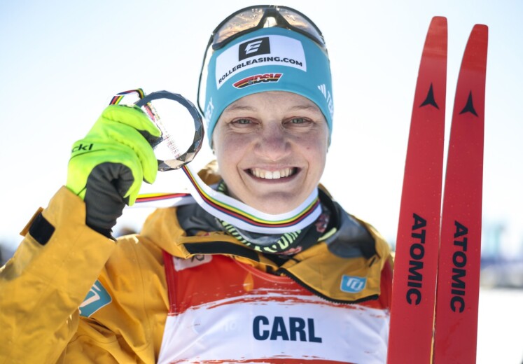 Eine wahre Sensation und ein Meilenstein in ihrer Karriere war neben Staffel-Silber der Olympiasieg im Teamsprint zusammen mit Katharina Hennig, nachdem Victoria noch auf der Zielgeraden im Doppelstockschub an Russland und Schweden vorbeigestürmt war. Damit trug sie maßgeblich zu den ersten deutschen Langlauf-Medaillen seit Sochi 2014 bei und Teamchef Peter Schlickenrieder konnte genau 20 Jahre nach seiner eigenen olympischen Silber-Medaille mit seinen Mädels über Gold jubeln. Nach Katharina Hennigs erstem Weltcupsieg arbeitete auch Victoria Carl immer mehr auf das erste Einzel-Podium hin, aber zunächst klappte es bei der WM in Planica wieder mit dem Team mit einer Silbermedaille. Die Thüringerin arbeitete verstärkt daran, ihre bestehenden Schwächen auszumerzen wie den Start und die Technik im klassischen Stil. „Meine Startschwäche im Sprint, wo ich immer schon einige Meter zurück hing, habe ich durch viele Motorikeinheiten mit den anderen Mädels verbessert. Auch meinen Diagonalschritt habe ich seit letztem Jahr super verbessert, da konnte ich mir von der Katha was abschauen, die da technisch super läuft, und ihren Schritt aufnehmen“, sagte sie. Aber auch im Kraftraum absolviert sie ein spezielles Training, das sich nun auszahlt. Im Podcast erzählte sie dazu: „Ich habe beim Training im Kraftraum was verändert und kann dadurch meine schnell zuckenden Muskelfasern besser behalten. Ich habe mein grundlegendes Krafttraining in einer sehr guten Physiotherapie, wo ich individuell auf mich und meine Schwächen abgestimmte Pläne kriege und wo ich in einem strominduzierten Krafttraining noch einmal mehr Muskelmasse anspreche bei den Übungen. Das greift dann so die muskulären Strukturen an, dass es für ordentlich Muskelkater sorgt. Einmal die Woche dieses strominduzierte Training, das ist mehr als genug.“ Damit ist nun auch ein Problem der Vergangenheit gelöst: „Weil ich eine sehr große Athletin bin, habe ich immer mit meinem Oberkörper viel rumgewackelt und mich verdreht und habe Energie verschwendet, die ich brauche und durch dieses Training, was auf meine Schwächen abzielt, kann ich auch viel stabiler im Oberkörper und in den ganzen Kniewinkeln meine Technik laufen.“