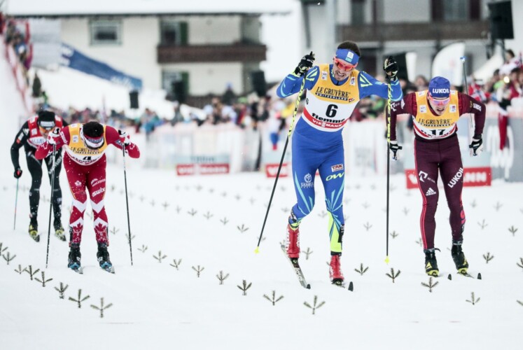 Bei der letzten Stadionpassage nahm das Quintett an der Spitze das Tempo heraus und Dario Cologna musste die Initiative ergreifen, um seinen Vorsprung auf Sundby und Ustiugov nicht zu verlieren. Didrik Tønseth musste die Kollegen ziehen lassen, so dass noch vier Sportler um den Sieg kämpften. Am letzten Anstieg grätschte der Schweizer neben der äußeren Spur und schnitt Alexey Poltoranin dabei leicht den Weg ab. Trotzdem gingen beide Seite an Seite in die anschließende Abfahrt ins Stadion. Der Kasache nahm mehr Schwung mit und kam als Erster über die Welle im Stadion mit Alex Harvey neben sich. Beide kämpften um den Sieg, aber der Kasache hatte noch am meisten zuzusetzen. Aus dem Windschatten holte sich sogar noch Andrey Larkov den zweiten Platz vor dem Kanadier und konnte sich über das erste Podium seiner Karriere freuen. „Die Strecke war sehr gut präpariert. Das Rennen ging sehr schnell los und bleib auch so während des ganzen Wettkampfes. Ich habe es geschafft, das ganze Rennen mit der Spitze mitzuhalten. Es ist unglaublich, dass ich dann mein erstes Podium überhaupt geholt habe“, sagte er auf der Pressekonferenz. Dario Cologna musste sich mit Platz vier begnügen. Rang fünf ging an Alexander Bolshunov vor Daniel Rickardsson, der sich gegen Rennende wieder etwas fing und Positionen gutmachte. Francesco de Fabiani wurde Siebter gefolgt von Hans Christer Holund, Didrik Tønseth und Niklas Dyrhaug. Martin Johnsrud Sundby verlor im heutigen Rennen als Elfter 28 Sekunden auf den Sieger, Sergey Ustiugov als 14. sogar 42 Sekunden. Damit ist Dario Cologna mit weit einer Minute Vorsprung an der Alpe Cermis wohl nicht mehr einzuholen.