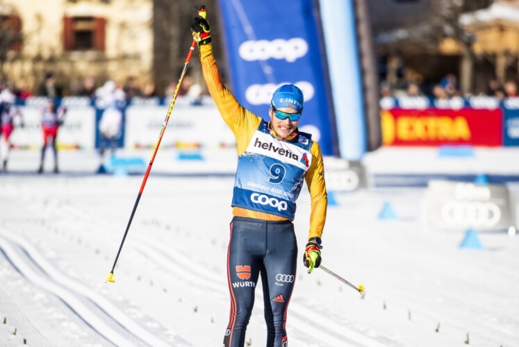 Ein achter Platz von Lucas Bögl ist wie schon gestern ein sehr gutes Ergebnis, aber es wäre noch so viel mehr möglich gewesen – wenn der Mann mit dem Hammer nicht wäre…. Bis kurz vor dem Ziel kämpfte der Bayer noch um Platz drei und war meist in vorderster Front zu finden. Auf der letzten Runde schwanden auch seine Kräfte dann aber sichtbar und 1,5 Kilometer vor dem Ziel musste er seine Gruppe ziehen lassen. Allein kämpfte er sich als Achter ins Ziel und liegt in der Tour de Ski nun an 13. Stelle. „Wenn 2020 so startet, dann kann es so weitergehen. Es war Wahnsinn. Wir haben immer die gute Gruppe gehabt, haben da bis Platz drei eingesammelt und wenn man da um Platz drei mitläuft, ist das einfach richtig gut. Zum Schluss ist mir leider etwas die Puste ausgegangen, aber es gibt immer was zu tun. Ich hab mich am Berg wahnsinnig stark gefühlt, super Material gehabt also vielen Dank an unsere Techniker, die haben einen super Job gemacht. Ich bin nur glücklich“, meinte er und analysierte: „Vielleicht habe ich einfach für mich persönlich mit meinen Voraussetzungen die Trainingsjahre gebraucht, um da vorne mit reinzukommen und habe bis Ende 20 warten müssen. Aber besser spät wie nie.“ Rang drei ging an Iivo Niskanen, der sich absetzen konnte und mit seiner Tempoverschärfung für das Herausfallen Bögls sorgte. Im Sprint aus der nun noch vierköpfigen Gruppe sicherte sich Artem Maltsev den vierten Platz vor Calle Halfvarsson, Sjur Røthe und Hans Christer Holund, der am Anfang zusammen mit Bolshunov zu schnell anging, aber dann einbrach, bevor er die Spitzengruppe erreicht hatte. Ivan Yakimushkin fiel auf den neunten Platz zurück vor Johannes Høsflot Klæbo, der zwischenzeitlich ebenfalls eine Schwächephase zu verkraften hatte, am Ende durch Bolshunovs Probleme den Rückstand aber auf unter eine Minute reduzierte. In der Tour de Ski-Wertung liegt er damit an dritter Stelle mit 26 Sekunden Rückstand.