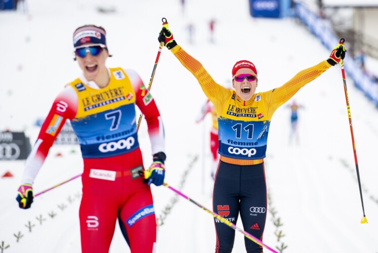 „Noch drei Etappen. Jetzt gilt es die letzten Kräfte zu mobilisieren, jetzt kommt meine Schokoladendisziplin, der Klassik Massenstart. Da freue ich mich besonders drauf. Ich denke nicht, dass jetzt vordergründig das Ziel ist, Therese Johaug zu schlagen. Die ist natürlich ein absolutes Ausnahmetalent. Das ist vielleicht ein bisschen weit weg im Moment. Wir versuchen immer weiter, die Lücke zu schließen und die Abstände werden auch immer geringer. Mit Geduld und Spucke kriegt man das hin“, meinte Katharina Hennig vor dem Start – ohne zu ahnen, dass es so schnell gehen würde. Die Sächsin war während des gesamten Rennens einer der Aktivposten und immer in vorderster Front zu finden. Zunächst sah jedoch alles nach business as usual aus: Therese Johaug hielt das Tempo hoch und versuchte, am Brink-Anstieg eine Lücke zu reißen mit Ebba Andersson, die sich in der anschließenden Anfahrt zum Omega aber sofort wieder schloss. In der schwierigen Kurve mit Höchstgeschwindigkeit kam die Norwegerin beim Umtreten zu Fall, Katharina Hennig konnte gerade noch ausweichen. Johaug brauchte eine Weile, um sich wieder in die Führungsposition der zu diesem Zeitpunkt siebenköpfigen Gruppe zu bringen und konnte sich während des gesamten Rennens nicht absetzen. Da das Tempo ohne Tempomacherin Johaug etwas langsamer war, wuchs die Gruppe bis Mitte der zweiten Runde auf 19 Damen an. Beim Sprint um Bonussekunden nach sechs Kilometern, den auch schon Jacobsen vor Andersson und Hennig gewann, setzten sich sechs Damen plus Nepryaeva und Maubet Bjornsen ab, die aber immer wieder aus der Spitzengruppe herausfielen und hinter den Top6 hinterherliefen.