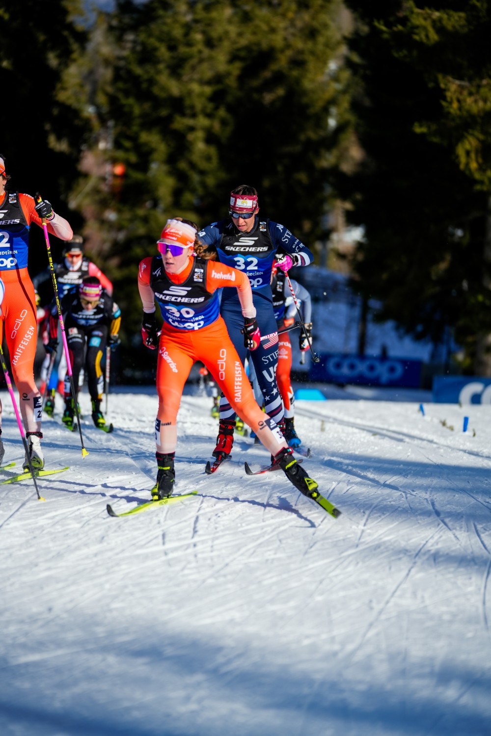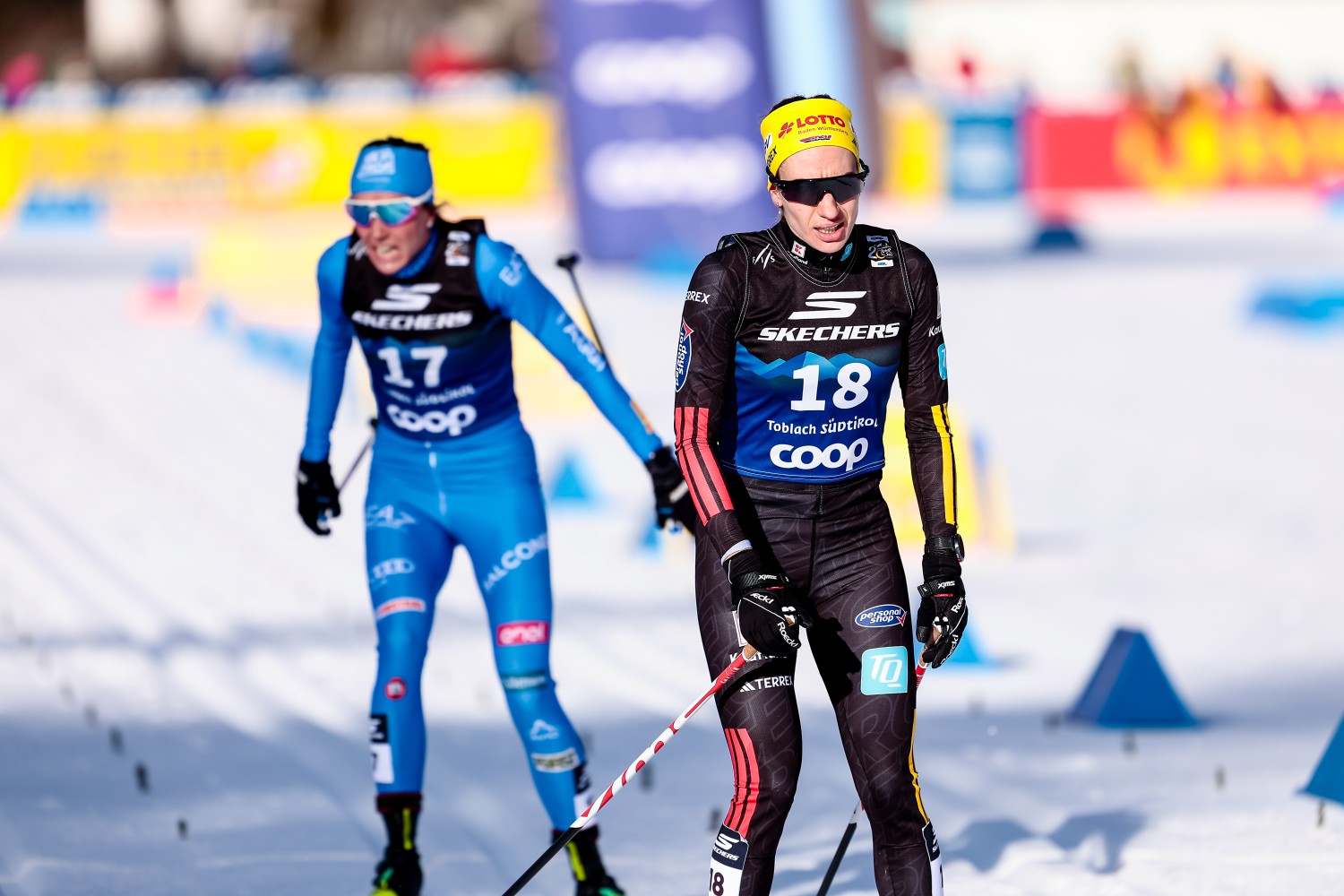 Nachdem Frida Karlsson noch in der zweiten Runde die Gruppe zusammen mit Andersson angeführt hatte, fiel sie auf dem Weg ins Stadion aus der Gruppe heraus. Im Laufe der nächsten Runden fing sie sich wieder und hatte noch eine gute Schlussphase, die auf Platz zehn endete. Knapp hinter ihr gewann Maja Dahlqvist den Zielsprint gegen Pia Fink, die sich zeitweise etwas schwer tat. In der dritten von fünf Runden fiel sie in ihrer schwächeren Technik aus der Gruppe um Andersson heraus und war kurze Zeit alleine unterwegs, bis sie eine neue Gruppe mit Dahlqvist, Ganz und später auch Karlsson fand. „Ich bin voll zufrieden. Gerade hier im Klassisch tu ich mich eher etwas schwer, von daher bin ich froh, dass es heute so ausgegangen ist“, so Pia Fink, die die Strecke in Toblach vor allem in der klassischen Technik gar nicht mag und die zwölf Sekunden hinter Andersson gestartet war. „Am Anfang war ich etwas überrascht, dass wir die vor uns eingeholt haben. Das Tempo war dann wirklich sehr hoch. Ich habe dann am Berg versucht, ein bisschen mein Tempo zu laufen und bin froh, dass ich ein paar Runden mitgekommen bin. Aber dann wurde es doch ganz schön hart. Ich habe mich darauf eingestellt, dass ich irgendwann die Lücke in der Abfahrt nicht mehr ganz schließen kann und dann habe ich dann mein Tempo gelaufen und habe ein paar andere Mädels gefunden, mit den es besser gepasst hat und das hat dann ganz gut geklappt die letzten zwei Runden.“