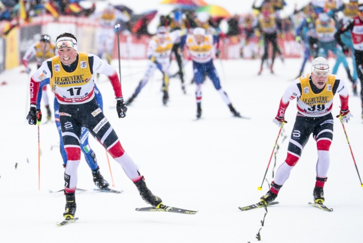Für die Herren galt es, sieben Runden a 2,1 Kilometer zu absolvieren und auch hier blieb der Pulk bis zum Schluss zusammen. Hakeleien, Stockbrüche und Stürze gab es am laufenden Band auf einer nicht selektiven Strecke, die zudem für die vielen Athleten zu eng war. Auf jeder Runde gab es mindestens einen Sturz und zu den Pechvögeln gehörte immer mindestens ein Russe – meistens mehrere. Wie seine Teamkollegin Ingvild Flugstad Østberg schob sich auch Emil Iversen zusammen mit einigen Landsmännern im Laufe der letzten Runde nach vorn und zog dann am Anstieg den Sprint an. Sindre Bjørnestad Skar und Francesco de Fabiani blieben ihm direkt auf den Fersen und kämpften um die Podestplätze. Doch Iversen war im Zielsprint stärker als Skar und jubelte über den Erfolg. Hinter Francesco de Fabiani belegte Dario Cologna den vierten Platz und festigte seine Führung in der Tour de Ski. „Es sieht gut aus, aber es ist noch nicht entschieden“, schmunzelte Dario. „Ustiugov ist ein starker Athlet, es gibt noch viele Bonussekunden in Val di Fiemme. Ich muss weiterhin angreifen. Bis jetzt läuft es gut und die Form ist sicher auch gut.“ Sein Rivale Sergey Ustiugov, der schon nach der Absage des Sprints stark verärgert war, stürzte in der fünften Runde und musste zunächst eine Lücke schließen. Überholen war auf der engen Strecke aber schwer möglich, so dass er es im Mittelfeld liegend auf der letzten Runde im Anstieg mit der Brechstange versuchte – und erneut strauchelte. Rang fünf ging an Finn Hågen Krogh gemeinsam mit Andrew Musgrave und Alex Harvey. Martin Johnsrud Sundby wurde Achter gefolgt von Thomas Bing und Maurice Manificat und Lucas Bögl. Jens Burman war wenige Meter vor der Ziellinie an neunter Stelle liegend gestürzt, so dass er über Platz 24 nicht hinauskam.