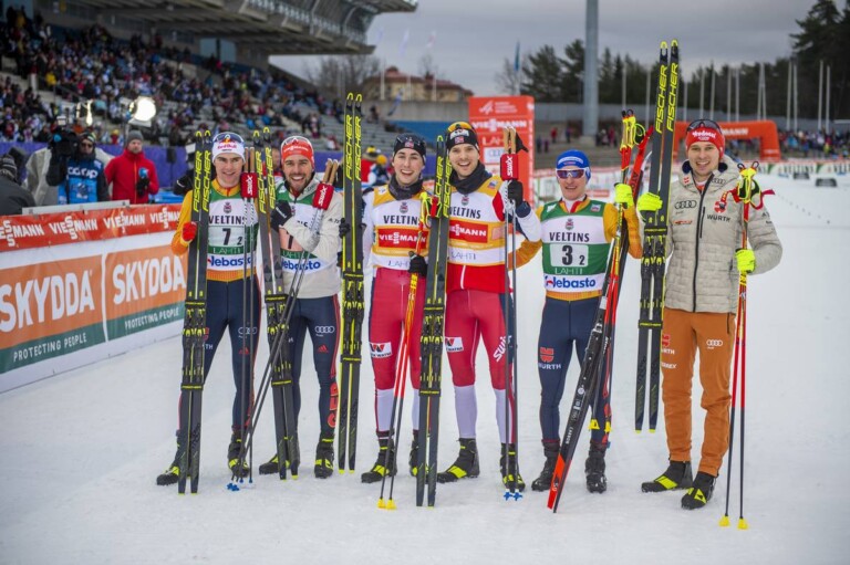 Vinzenz Geiger (GER), Johannes Rydzek (GER), Jarl Magnus Riiber (NOR), Joergen Graabak (NOR), Manuel Faisst (GER), Terence Weber (GER), (l-r) - FIS world cup nordic combined, team sprint HS130/2x7.5km, Lahti (FIN). www.nordicfocus.com. © THIBAUT/NordicFocus. Every downloaded picture is fee-liable. © THIBAUT/NordicFocus