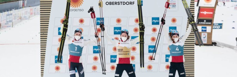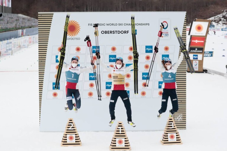 Nordische Kombination: Impressionen vom Damenwettkampf Sprung ins Glück: Mari Leinan Lund (NOR), Gyda Westvold Hansen (NOR) und Marte Leinan Lund (NOR) bei der Siegerehrung. © Modica/NordicFocus 1 2 3 4 5 6 7 8 9 10 11 12 13 14 15 16 17 18 19 20 21 22 23 24 25 26 27 28 29 30 31 © Bilder 1 - 21: Modica/NordicFocus; Bilder 22 - 31: Thibaut/NordicFocus;
