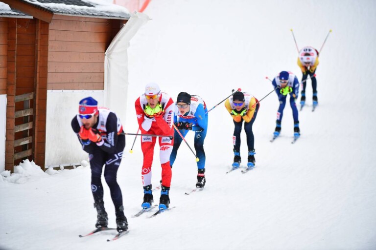 Wie an der Perlenschnur: Wendelin Thannheimer (3. von rechts) und Simon Hüttel (hinten) im Verfolgerfeld. © Reichert/NordicFocus