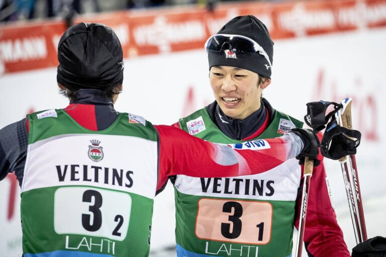 Glücklich über Rang drei: Ryota Yamamoto (r) mit Akito Watabe. © Modica/NordicFocus
