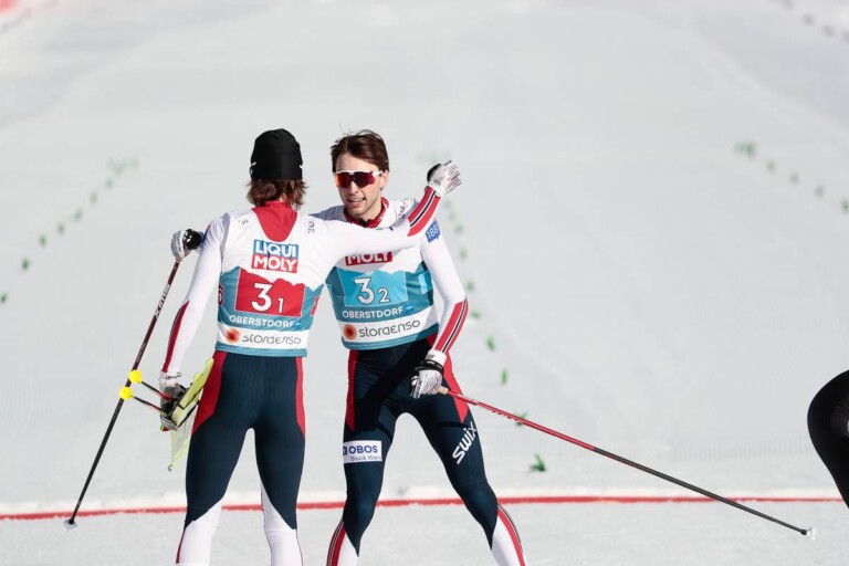 Nordische Kombination: Impressionen vom Teamsprint Espen Andersen empfängt Jarl Riiber im Ziel. © Modica/NordicFocus 1 2 3 4 5 6 7 8 9 10 11 12 13 14 15 16 17 18 19 20 21 22 23 24 25 26 27 28 29 30 31 © Bilder 1 - 4: Thibaut/NordicFocus; Bilder 5 - 31: Modica/NordicFocus;