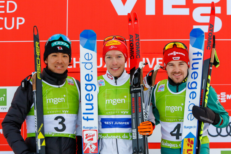 Die beste Ausgangsposition aus deutscher Sicht hatte erneut Fabian Riessle, der auf der Schanze in Chaux-Neuve anscheinend sehr gut zurechtkommt. Mit 111,5 Metern bei vergleichsweise viel Rückenwind landete er auf Zwischenrang vier, 54 Sekunden hinter Rehrl. Eine Sekunde vor ihm startete Akito Watabe, während Österreichs Mario Seidl zeitgleich mit Riessle ins Rennen gehen konnte. Dahinter sortierte sich vor Riiber noch der Vortageszweite Espen Bjoernstad (NOR) ein. Auf Platz 8 nach dem Springen landete Terence Weber (Geyer), der mit 114 Metern die günstigen Bedingungen für sich nutzen konnte. Manuel Faisst (Baiersbronn) komplettierte die Top Ten ebenfalls mit 114 Metern. Grund zum Jubeln hatte endlich einmal Eric Frenzel. Der Oberwiesenthaler, der in dieser Saison mit seiner Sprungform hadert, kam auf gute 112,5 Meter und damit auf den 15. Platz. Nicht ganz zufrieden waren die beiden Oberstdorfer. Johannes Rydzek und Vinzenz Geiger landeten bereits bei 105 und 106,5 Metern, und damit nur auf den Rängen 22 und 23. Ihr Rückstand auf den Führenden betrug rund zweieinhalb Minuten.