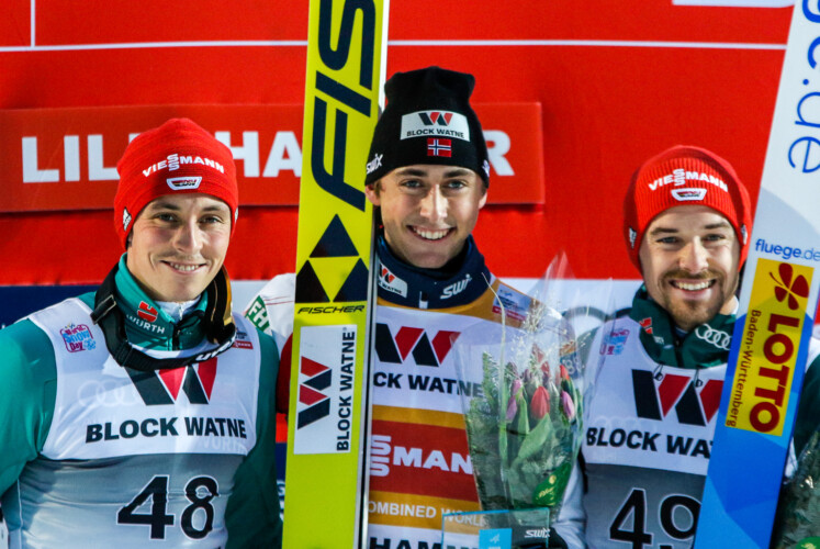 Den zeigte der Österreicher dann auch. 92,5 Meter brachten ihn am Ende auf den achten Platz nach vorne. Damit zeigte er sich zufrieden, auch wenn er durch die umgekehrte Reihenfolge des Wettkampfs beim Sprung doch etwas „Kaugummihaxn“ hatte. Auch die deutschen Starter zeigten gute Sprünge. Zunächst legte Rydzek 94 Meter vor, dann folgte Frenzel mit 95 Metern, und Rießle konnte 93 Meter beisteuern. Dann jedoch kam Riiber. Der Norweger machte seinem Ruf als hervorragender Springer mal wieder alle Ehre und segelte auf 100 Meter hinab. Mit 8,1 Punkten Vorsprung vor Frenzel feierte er einen überlegenen Sieg. Gefolgt von Rießle, der sich Frenzel um 0,1 Punkte geschlagen geben musste. Dahinter schob sich Akito Watabe (JPN) noch vor Rydzek. Laufsieger Magnus Krog kam auf den sechsten Platz vor Geiger und Seidl.