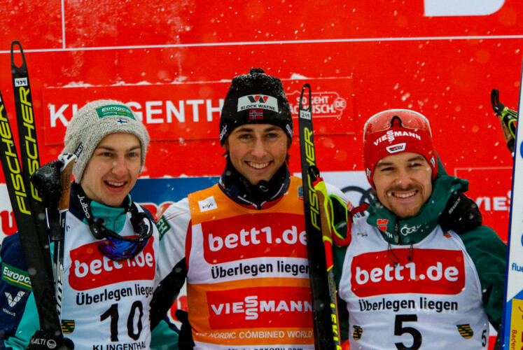 Starker Wind und Schneefall haben ein Skispringen am heutigen Sonntag unmöglich gemacht. Zum Glück gibt es für solche Fälle in der Nordischen Kombination den so genannten PCR, den provisorischen Wettkampfdurchgang. Dieser wird jeweils einen Tag vor dem ersten Wettkampf ausgetragen – und den hatte in Klingenthal Manuel Faisst gewonnen. Der Baiersbronner sprang bei Rückenwind auf 135 Meter und sicherte sich damit die vorläufige Pole Position. Auf Platz zwei kam Willi Denifl (AUT), der mit 137,5 Metern für den weitesten Sprung des Tages sorgte. Er hatte allerdings auch günstigere Bedingungen und bekam dementsprechend Punktabzug, was ihm einen Rückstand von acht Sekunden auf Faisst einbrachte. Sein Landsmann Franz-Josef Rehrl wurde Dritter, gerade einmal eine Sekunde hinter Denifl, während Weltcup-Spitzenreiter Jarl Riiber mit 130 Metern Vierter wurde. Sein Rückstand auf Faisst betrug aber nur 15 Sekunden. Wer Riiber kennt, weiß, dass das nichts für ihn ist. Zumal sein größter Rivale im Kampf um die Gesamtwertung, Johannes Rydzek (Oberstdorf), im PCR nur auf 114,5 Meter und damit auf den 22. Rang kam. Fast zwei Minuten Rückstand auf Riiber sorgten bereits für eine klare Vorentscheidung – zumindest was die Gesamtwertung anging.