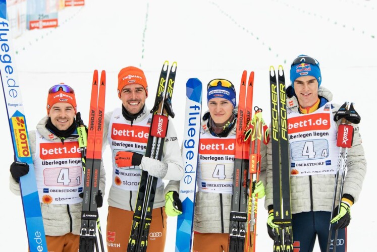 Dass die Norweger in dieser Saison die Szene bestimmen, ist nicht neu. Selten jedoch zeigte sich die ganze Mannschaft so dominant wie heute in Oberstdorf. Den weitesten Sprung des Wettkampfs zeigte Jens Oftebro. Auch dank der günstigsten Windbedingungen in seiner Gruppe sprang er auf hervorragende 136 Meter. Jarl Riiber in Gruppe zwei stand ihm nur um einen halben Meter nach. Joergen Graabak landete bei 130 Metern. Alle drei siegten in ihrer jeweiligen Gruppe. Lediglich Espen Bjoernstad musste sich in seiner Startgruppe mit dem zweiten Rang zufrieden geben. Er konnte sich allerdings damit trösten, dass Norwegen insgesamt klar in Führung lag und mit enormen 1:27 Minuten Vorsprung in die Loipe gehen konnte.